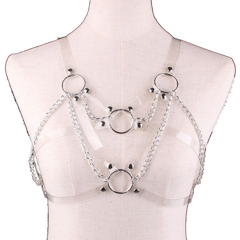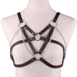 BDSM Leather Body Harness with Metal Chain / Women Bra Top Chest Chain Belt Accessory