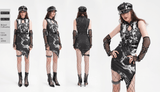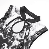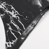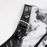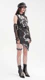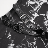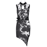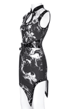Embrace the darkness in this gothic black and white dress with a smoky marble pattern and delicate spiderweb accents. Its sleeveless cut, uneven hemline, and faux leather buckle details create a striking, edgy look. Ideal for gothic events, concerts, or everyday dark fashion, this dress lets you showcase your bold and distinctive style.