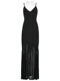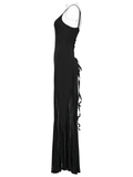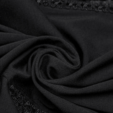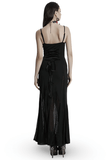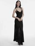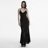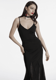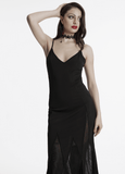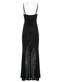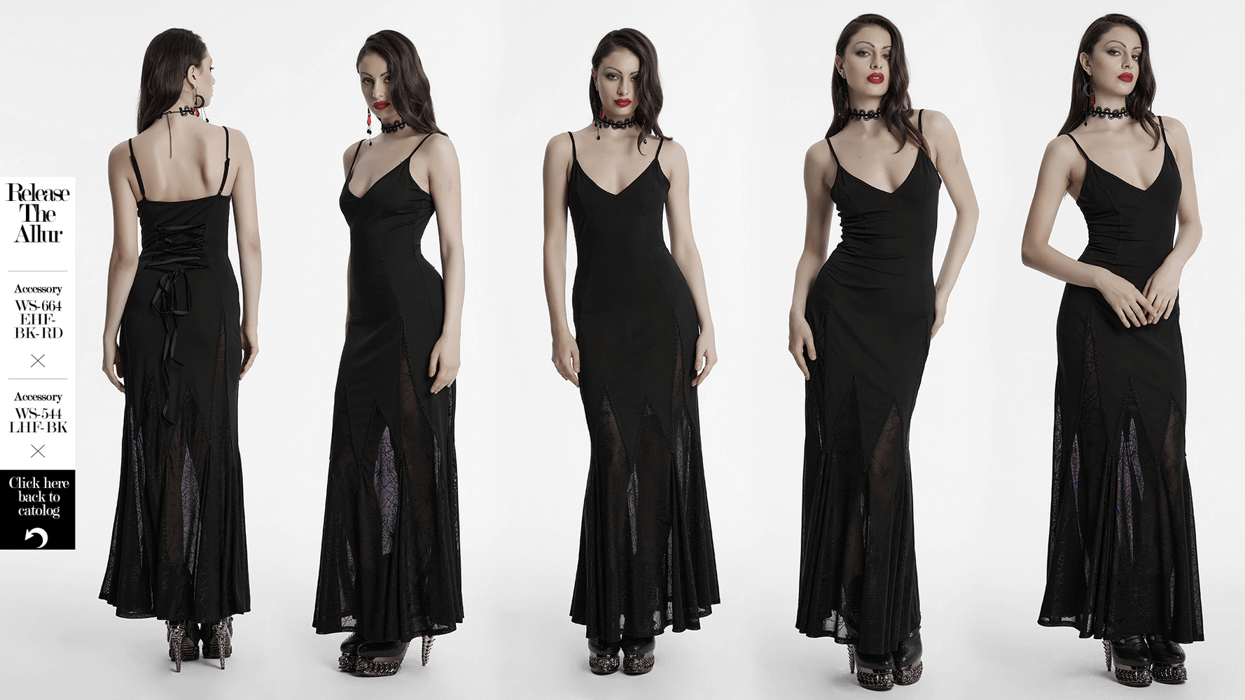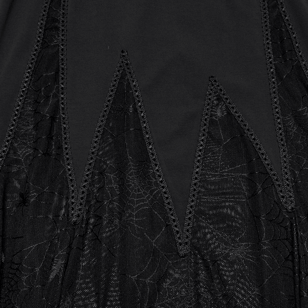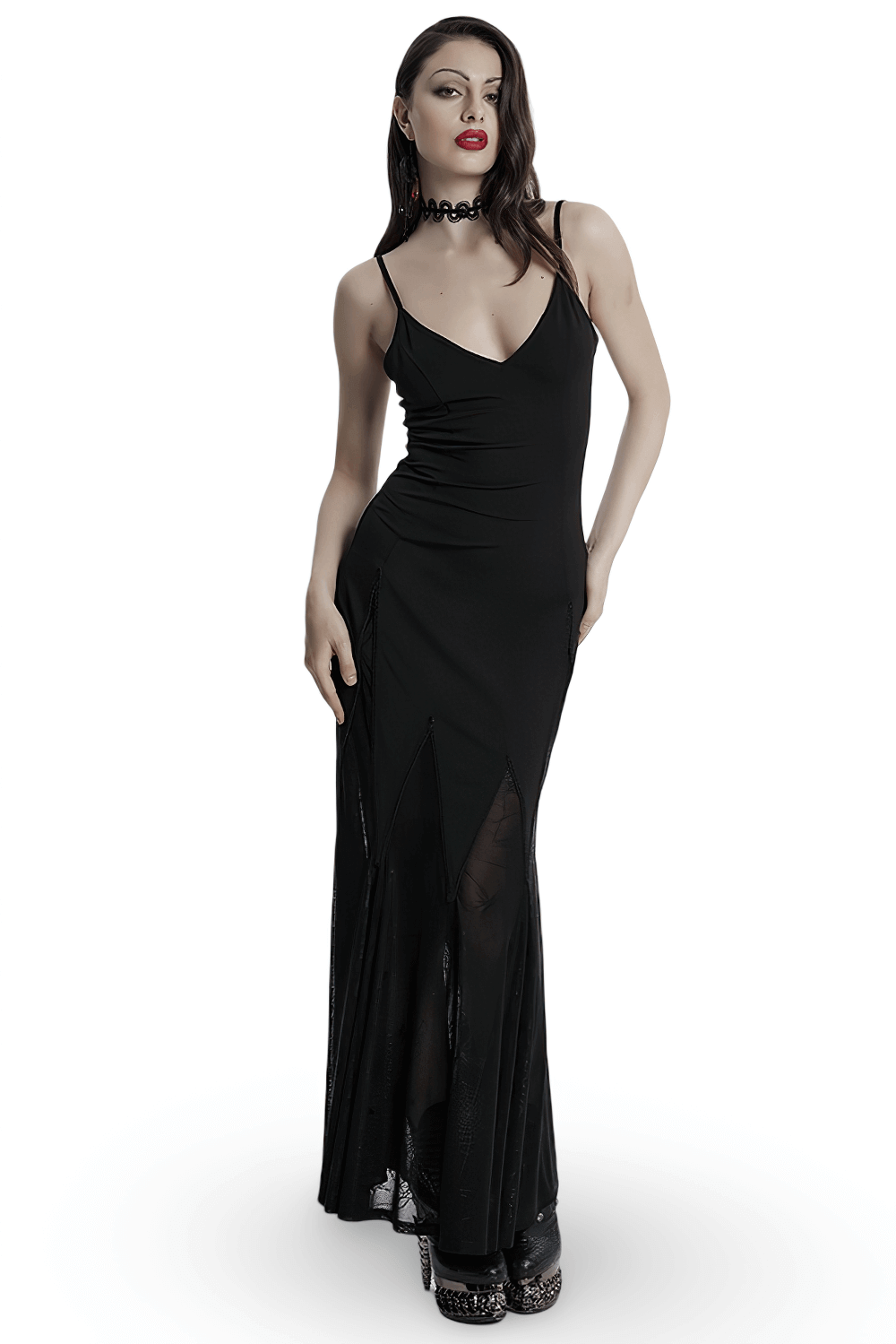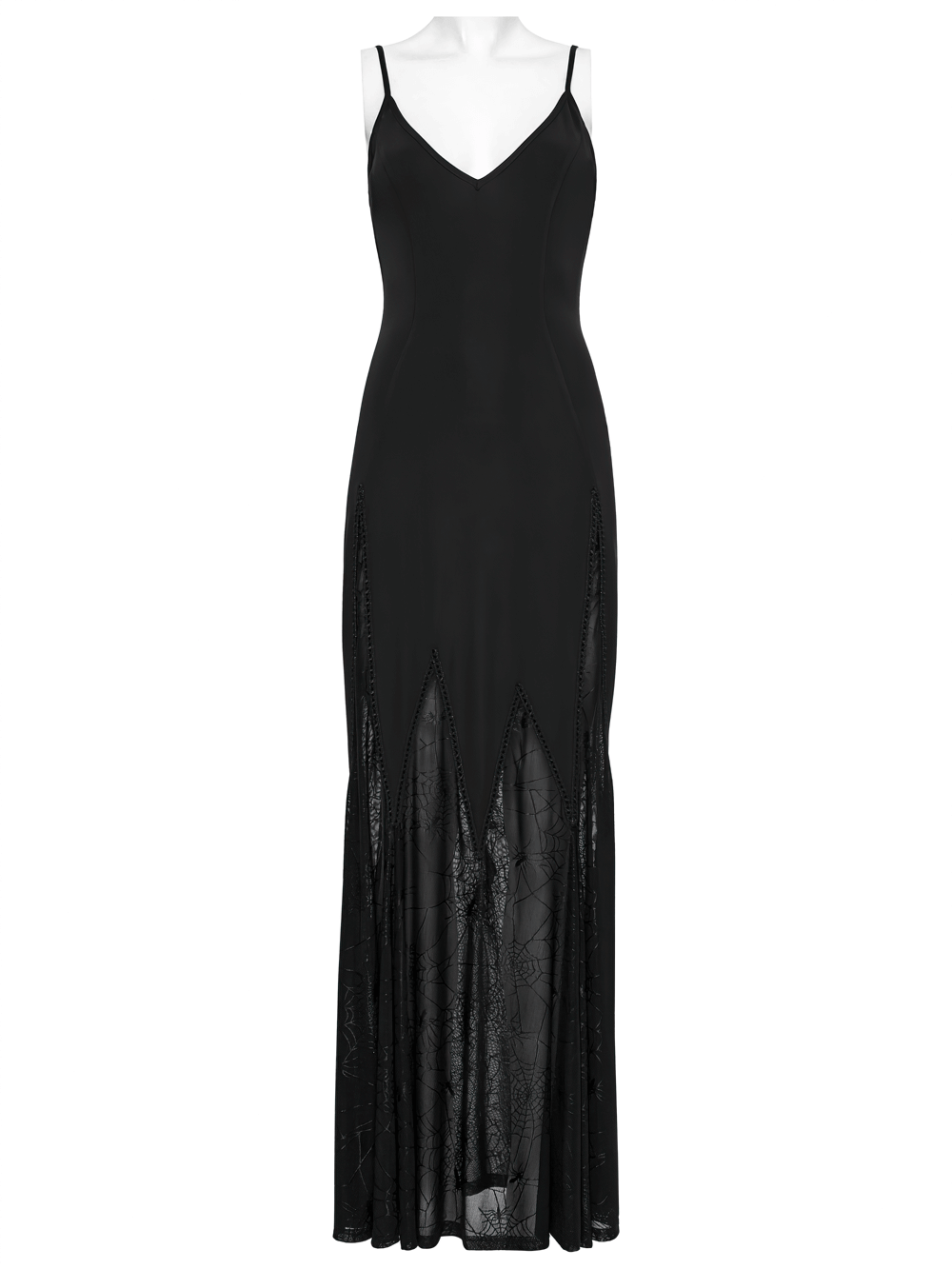 This black gothic maxi dress showcases a refined V-neck and a bold asymmetric pointed hem with sheer splicing elements. Crafted from stretchy knitted fabric and spider mesh, it creates a sleek silhouette with delicate webbing accents along the edges. The lace-up corset-style back ensures an adjustable fit, adding a vintage flair. Ideal for gothic fashion enthusiasts and standout evening styles.