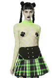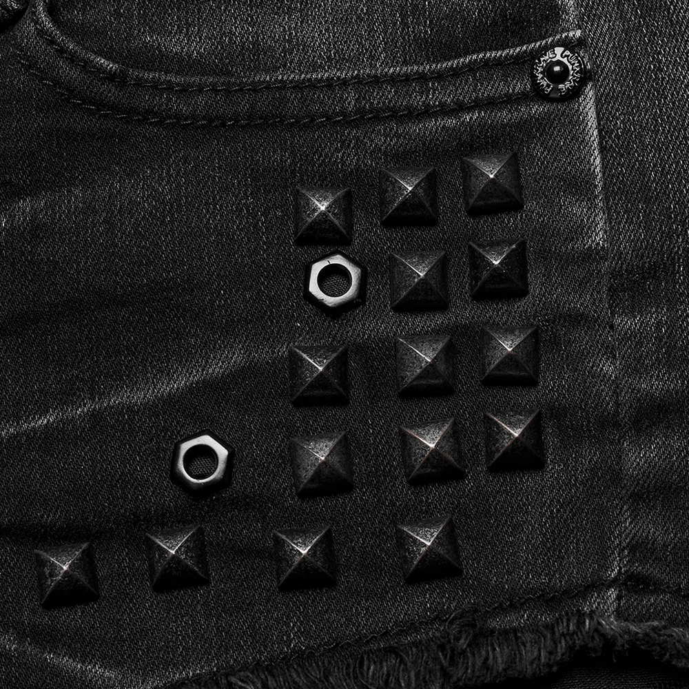 Unleash your inner rockstar with these daring black denim hot pants. Boasting a distinctive design, one side is adorned with striking square rivets, while the other showcases playful ribbon drawstrings. Raw-edged accents and a foldable decorative patch at the waist infuse a hint of grunge. Crafted from stretchy denim fabric for optimum comfort, these hot pants are ideal for a night out on the town.