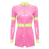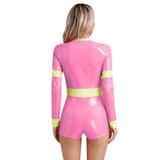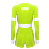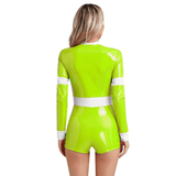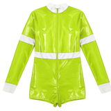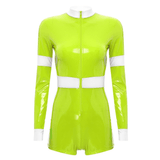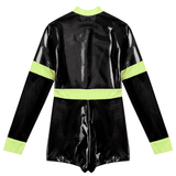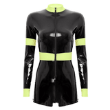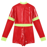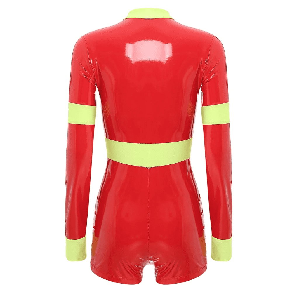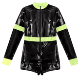 Unleash daring style with this chic firefighter-inspired bodysuit, perfect for making a bold statement at your next event. Crafted from sleek, glossy vinyl that hugs your curves, this long-sleeve one-piece offers a high-contrast look with its vibrant, high-visibility yellow trim. Designed for the modern, fashion-forward individual, the bodysuit features a sturdy front zipper, allowing for an adjustable neckline to suit your desired level of allure. The high collar adds a touch of sophistication, while the short bottom cut accentuates the legs, making it ideal for pairing with boots or heels. Whether you're headed to a themed party or just looking to add some edgy flair to your wardrobe, this outfit is guaranteed to turn heads.