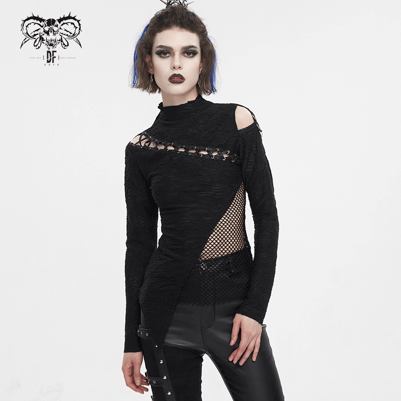 Explore the heart of alternative fashion with our women's gothic patchwork top. This unique garment, featuring patchwork styling, boasts an irregular hem for added allure. The half-high neckline exudes sophistication, blending edginess with elegance seamlessly. Embrace the darker aspects of fashion while ensuring your individual style shines through.