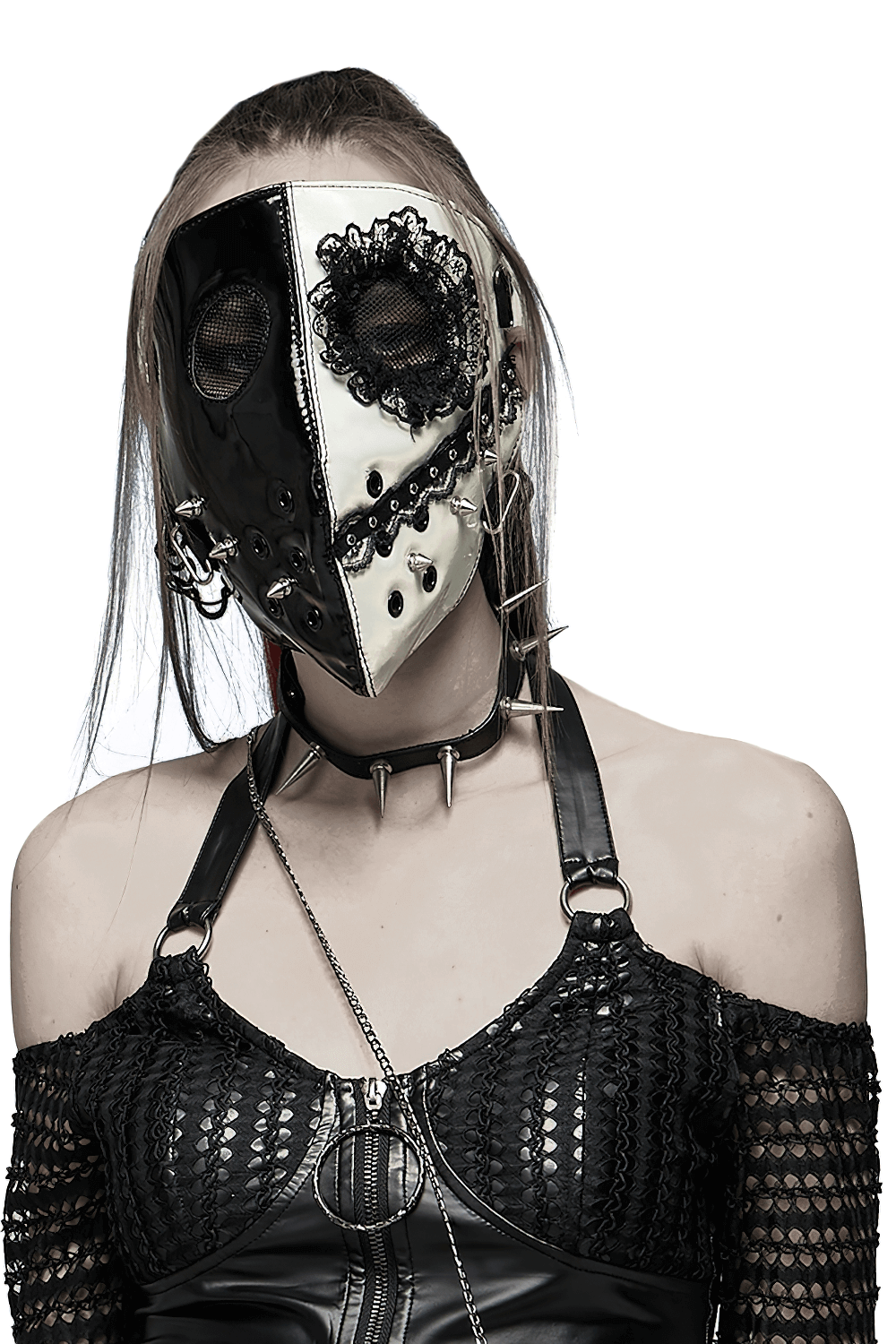 Enhance your alternative look with this bold black and white patent leather mask. Detailed with elegant lace, it blends gothic charm with utility. Adjustable rubber straps offer a secure fit, while ventilation holes add practicality. Ideal for dark Lolita, gothic, or cosplay styles, this mask is a standout accessory for making a striking statement.