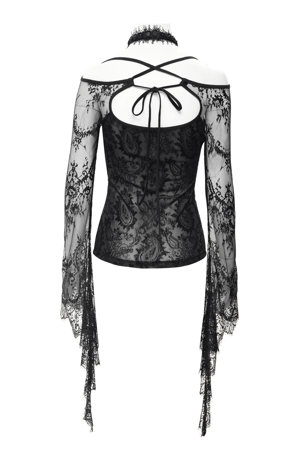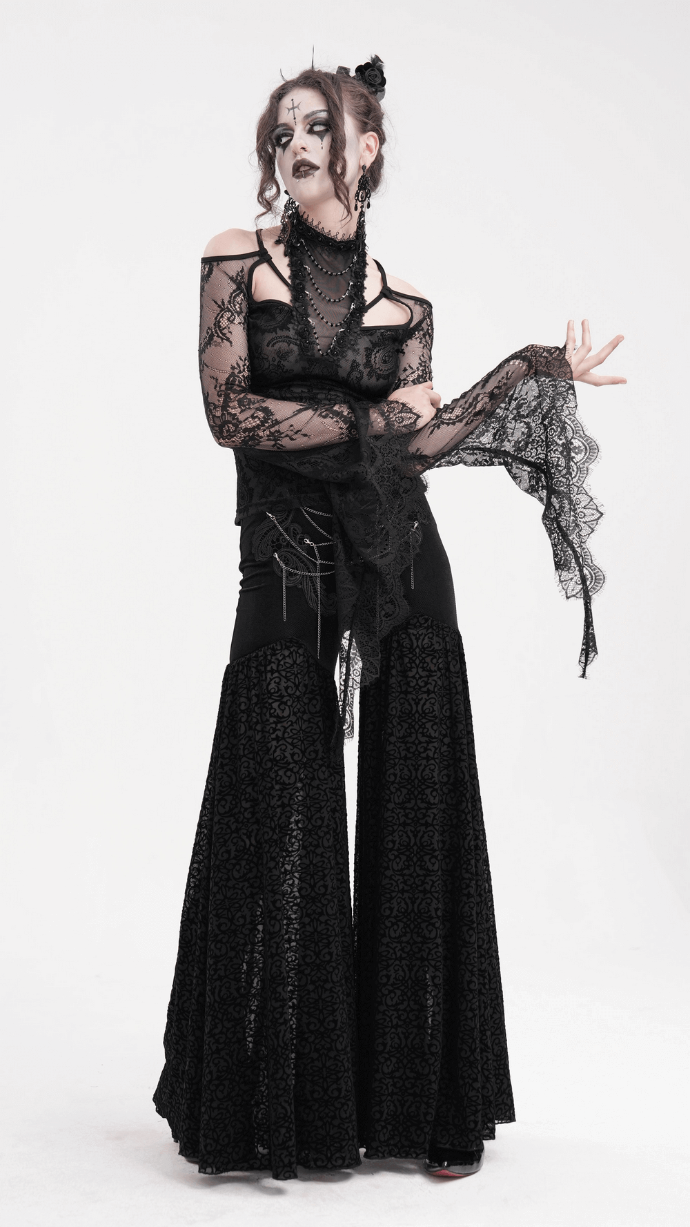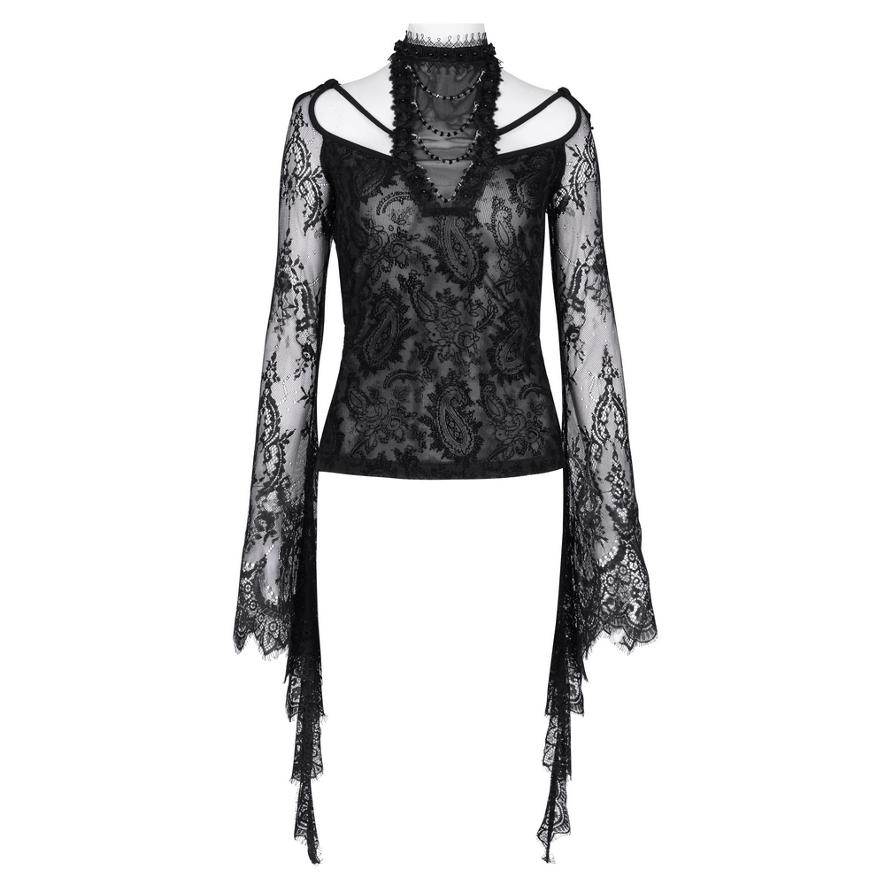 Gothic Black Lace Top with Bell Sleeves and Neck Chains