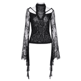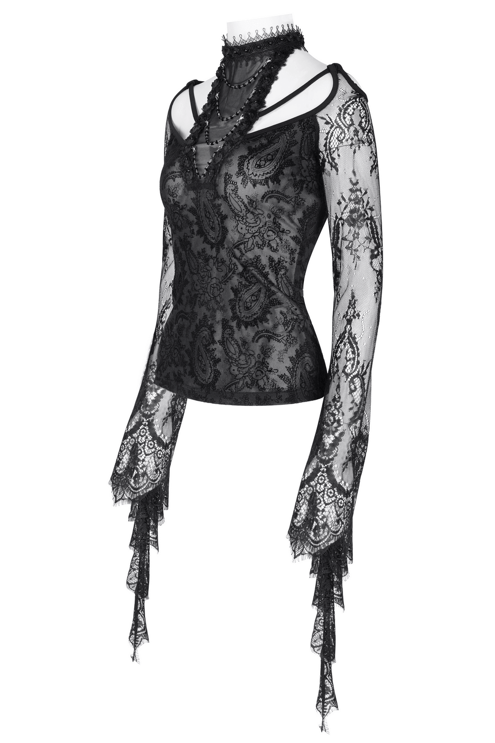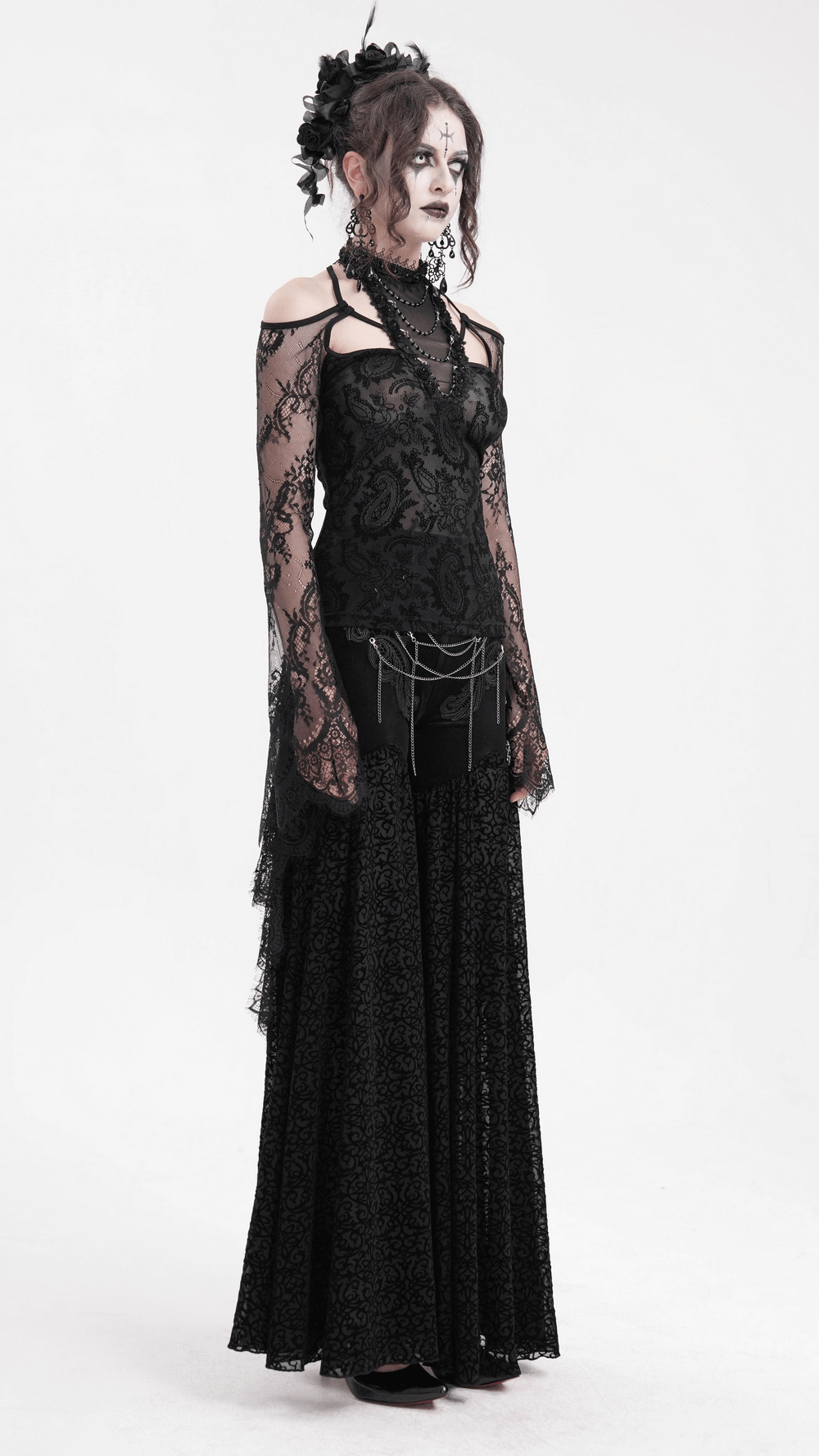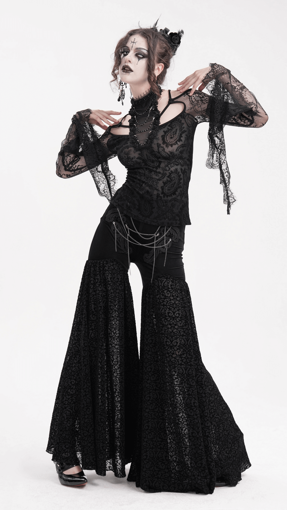 Gothic Black Lace Top with Bell Sleeves and Neck Chains