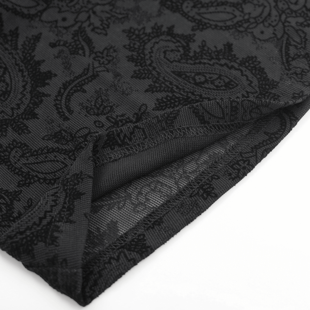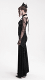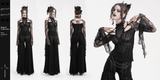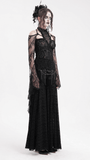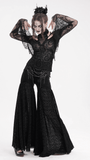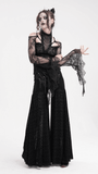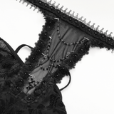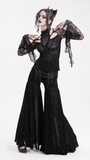 Enhance your gothic style with this black lace top, showcasing elegant floral designs and bold bell sleeves. Victorian-inspired neck chains and a strappy neckline add a dark, romantic touch, while the open back with lace-up accents offers an adjustable fit. Perfect for gothic gatherings, cosplay, or alternative fashion, this top is the ultimate statement piece for your dark and edgy wardrobe.