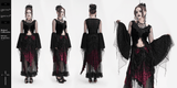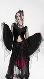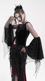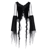 Capture the essence of gothic fashion with this lace top, designed with dramatic bell sleeves and an asymmetrical hem. Made from delicate black mesh adorned with floral appliques, it creates a captivating silhouette. The flowing sleeves bring a medieval flair, while the fitted bodice contrasts sleekly. Ideal for layering or as a bold statement piece, this gothic blouse suits events, cosplay, or daily wear.