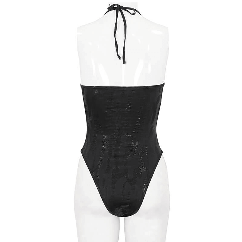 Express your unique style with our black gothic one-piece swimsuit. Combining audacious aesthetics with practicality, featuring metal loops for an edgy twist. Sleek design contours, ensure a striking appearance. Whether sunbathing or swimming, flaunt your alternative taste with this attention-grabbing swimsuit.