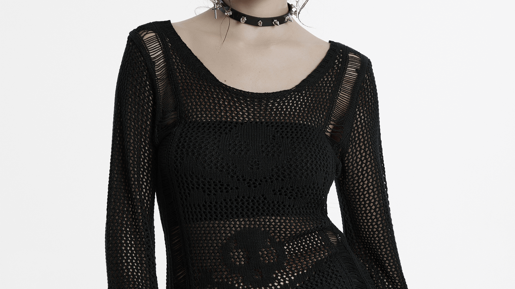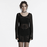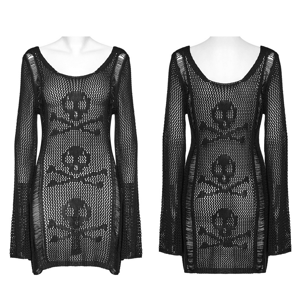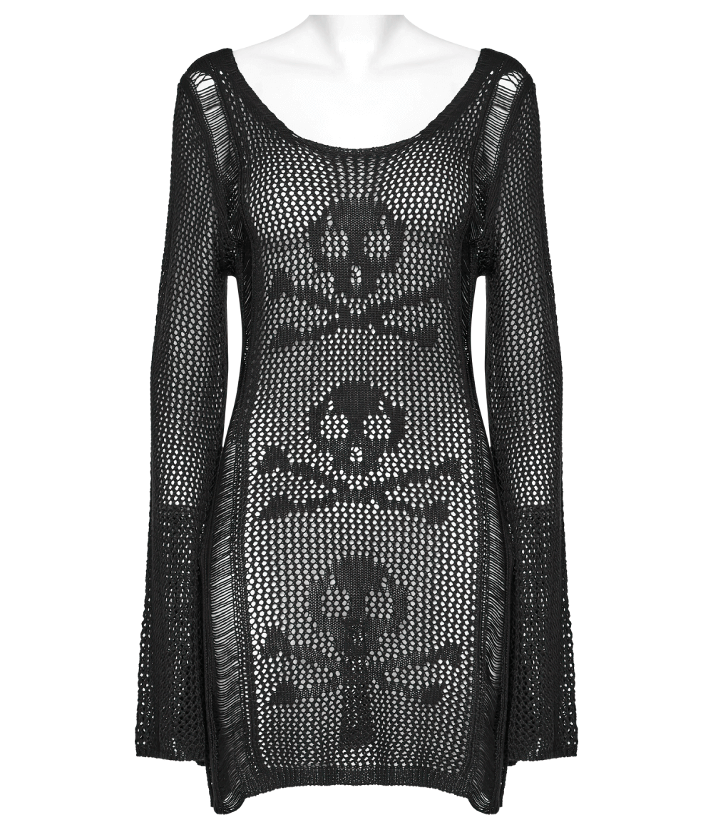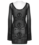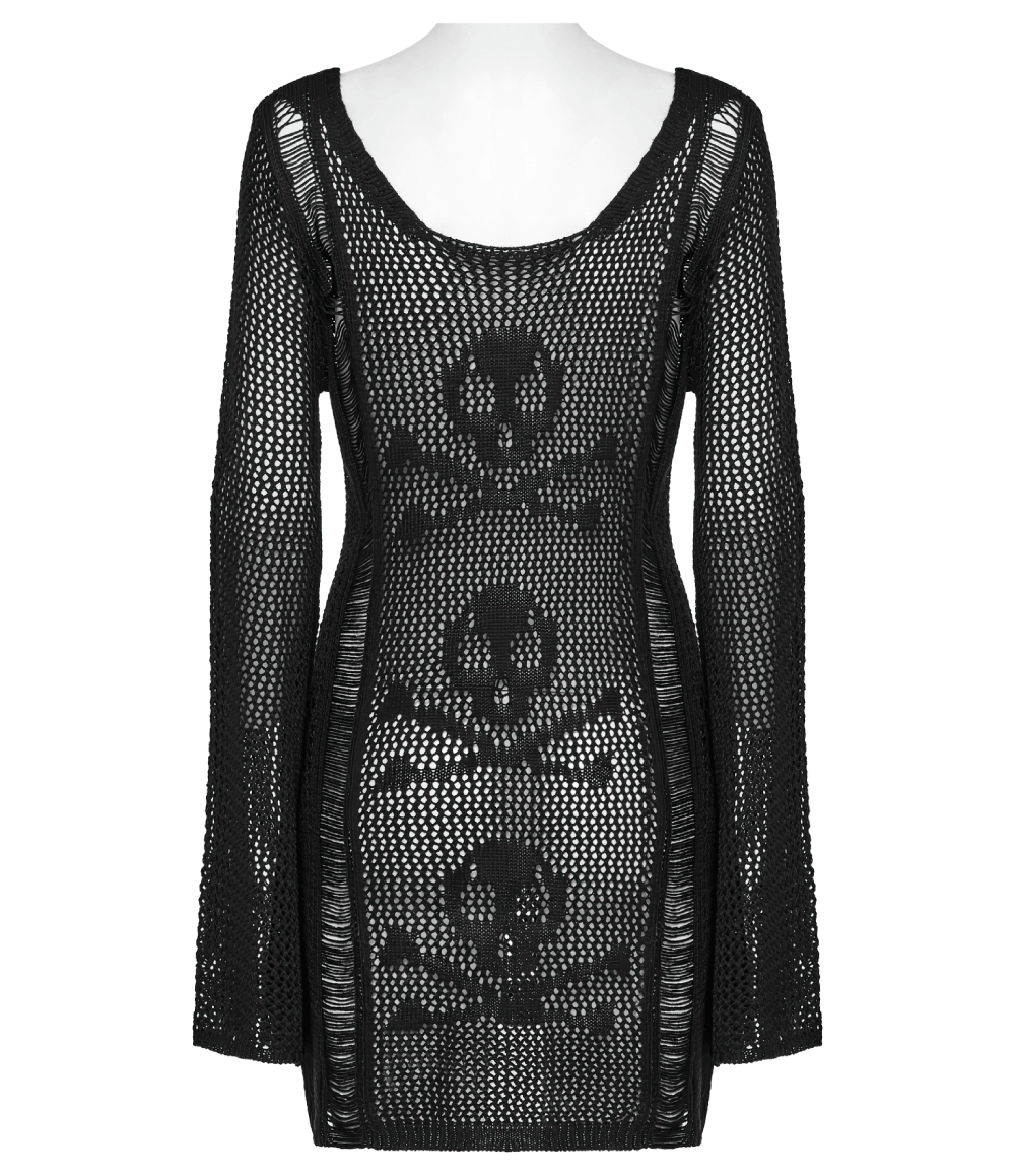 Gothic Black Skull Knit Mesh Dress with Sheer Long Sleeves