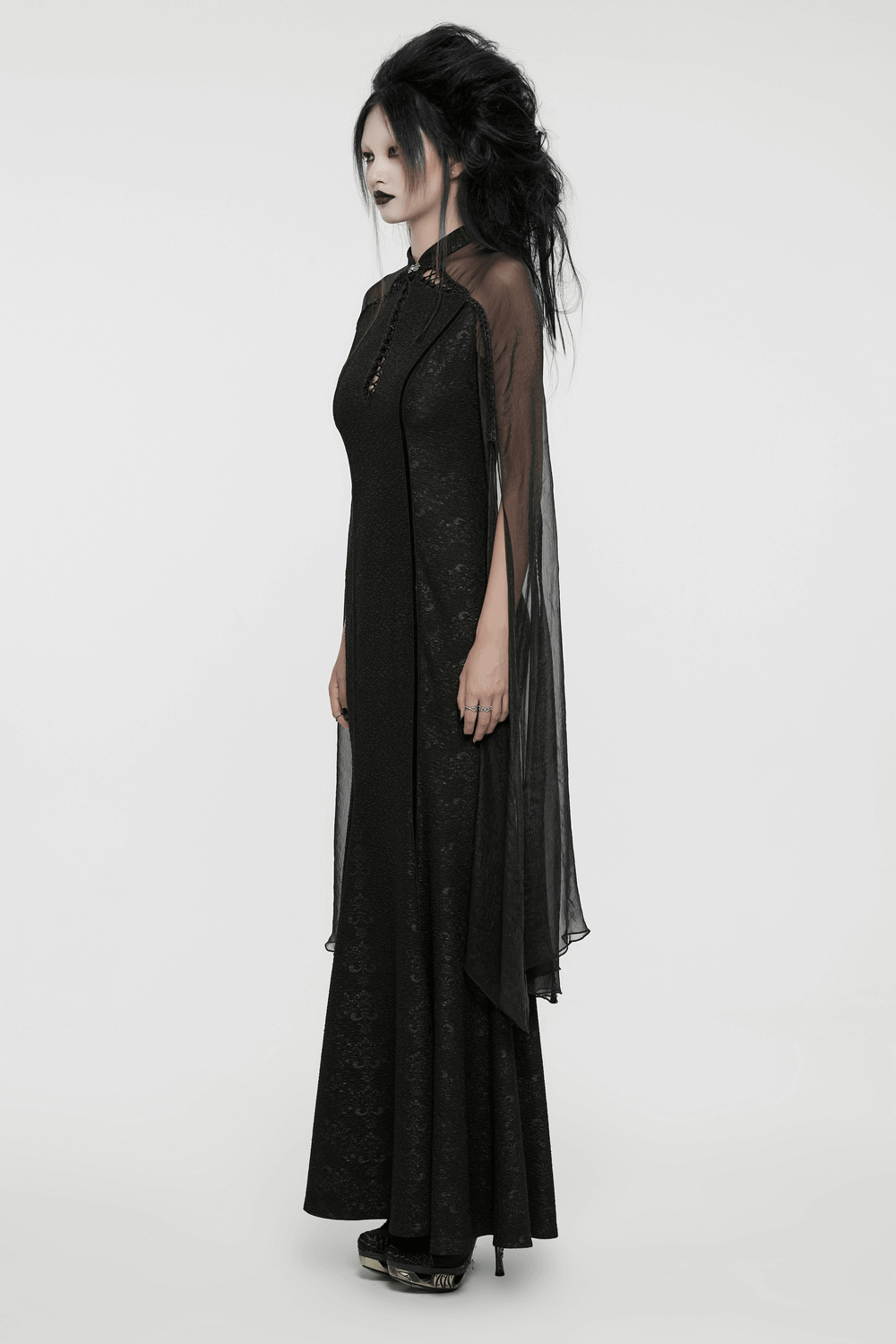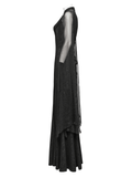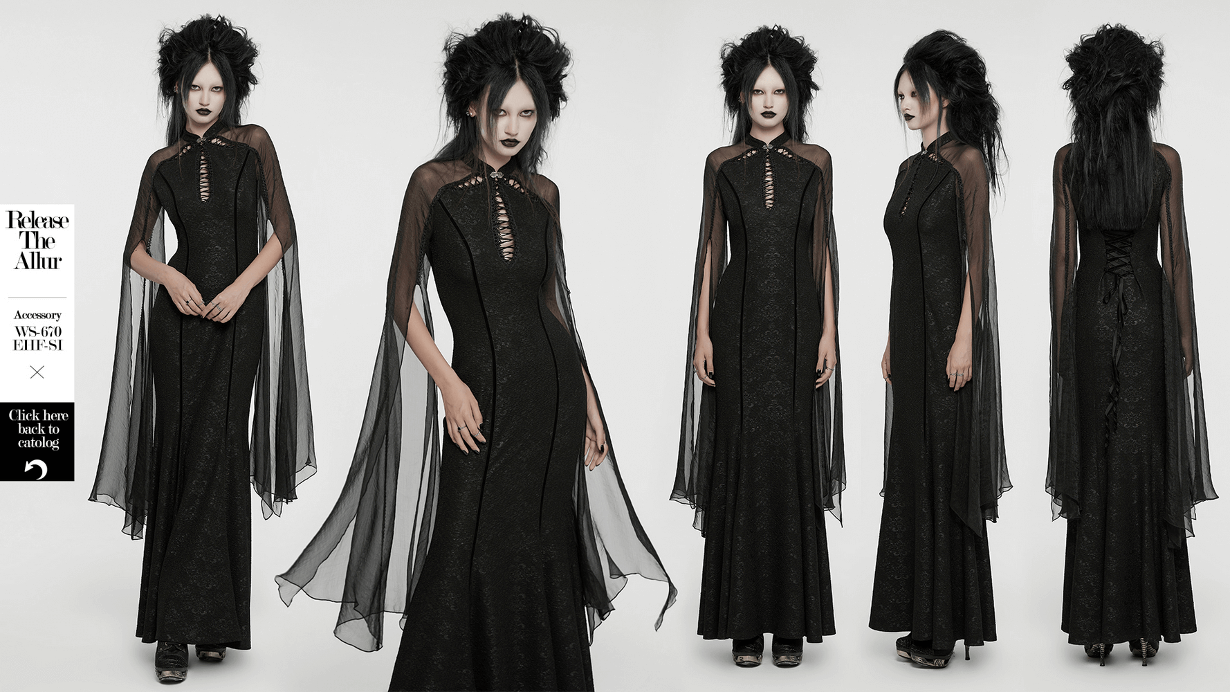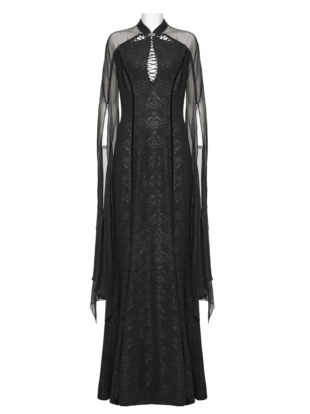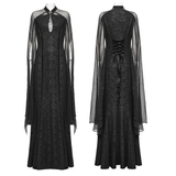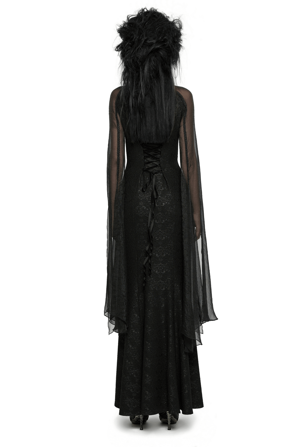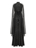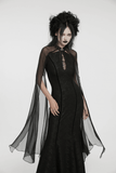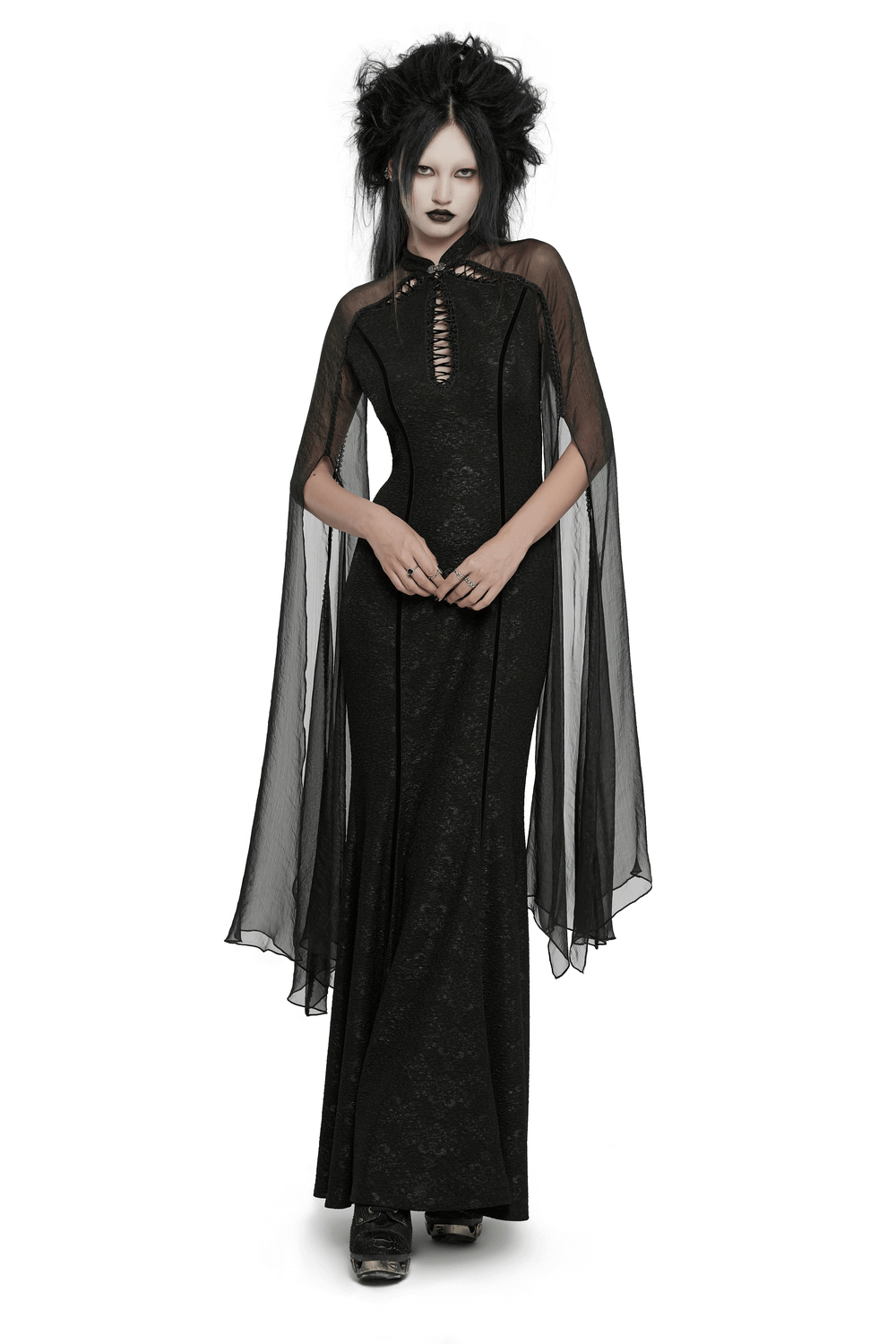 This captivating gothic dress combines stretchy textured knit fabric with flowing chiffon for a magical look. A hollow drawstring detail at the chest adds intrigue, while the light, split chiffon sleeves exude grace. The fishtail silhouette enhances your curves, and the adjustable lace-up back ensures a personalized fit. Perfect for channeling dark fairy vibes, this dress is an elegant addition to any gothic wardrobe.