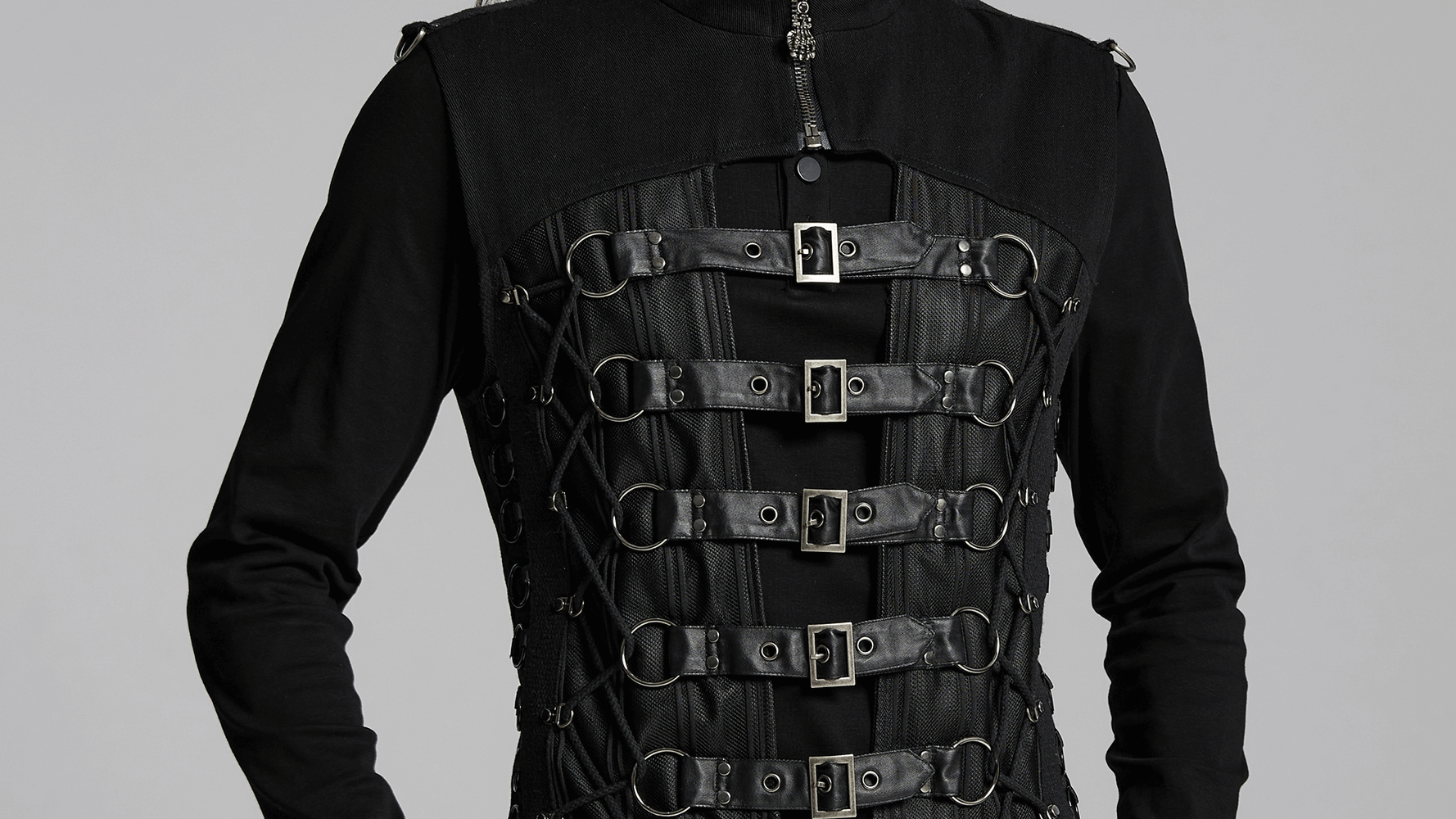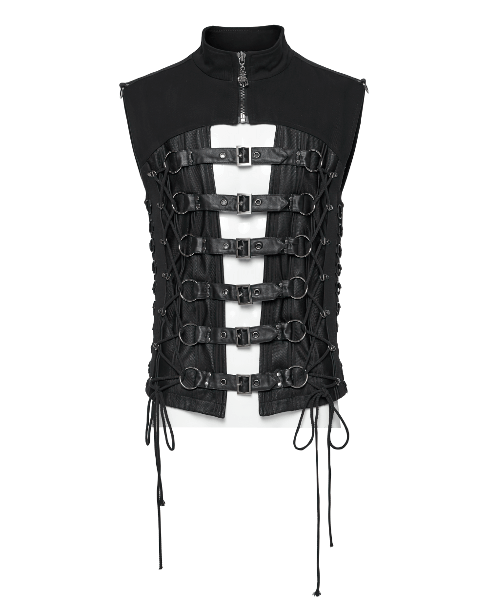 Enhance your punk style with this striking gothic vest made from rubberized twill fabric and striped mesh. The half-cut hollow front and oversized buckles radiate bold energy, while metal rings and D-buckle accents create visual depth. Designed with lace-up sides and back, this vest delivers a powerful silhouette for alternative fashion enthusiasts. Ideal for making a bold statement.