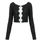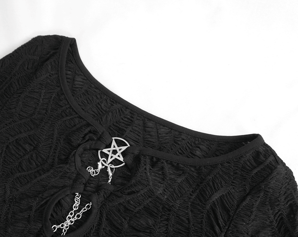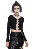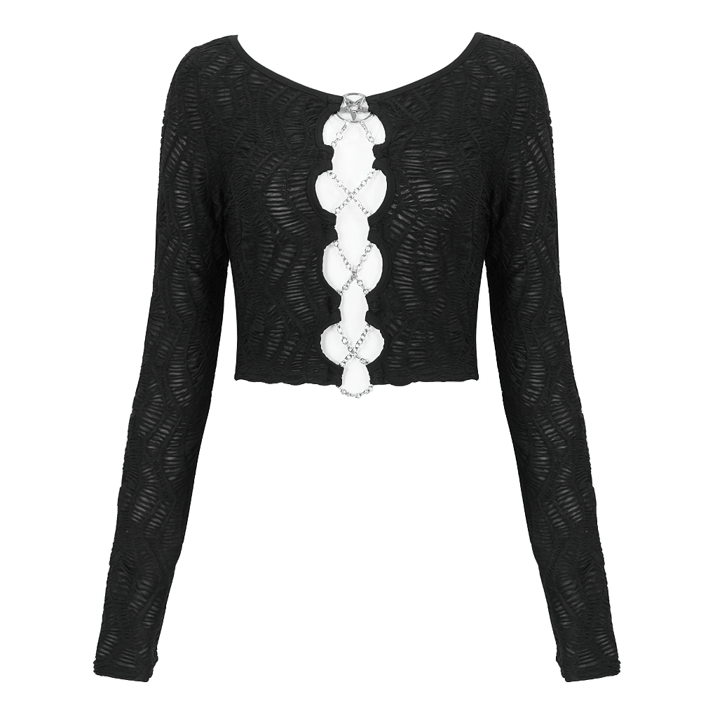Discover your sultry side with our gothic black crop top. Merging mystique with allure, it features long sleeves, cut-outs, and delicate chain lace-up details. Perfect for the daring fashionista.