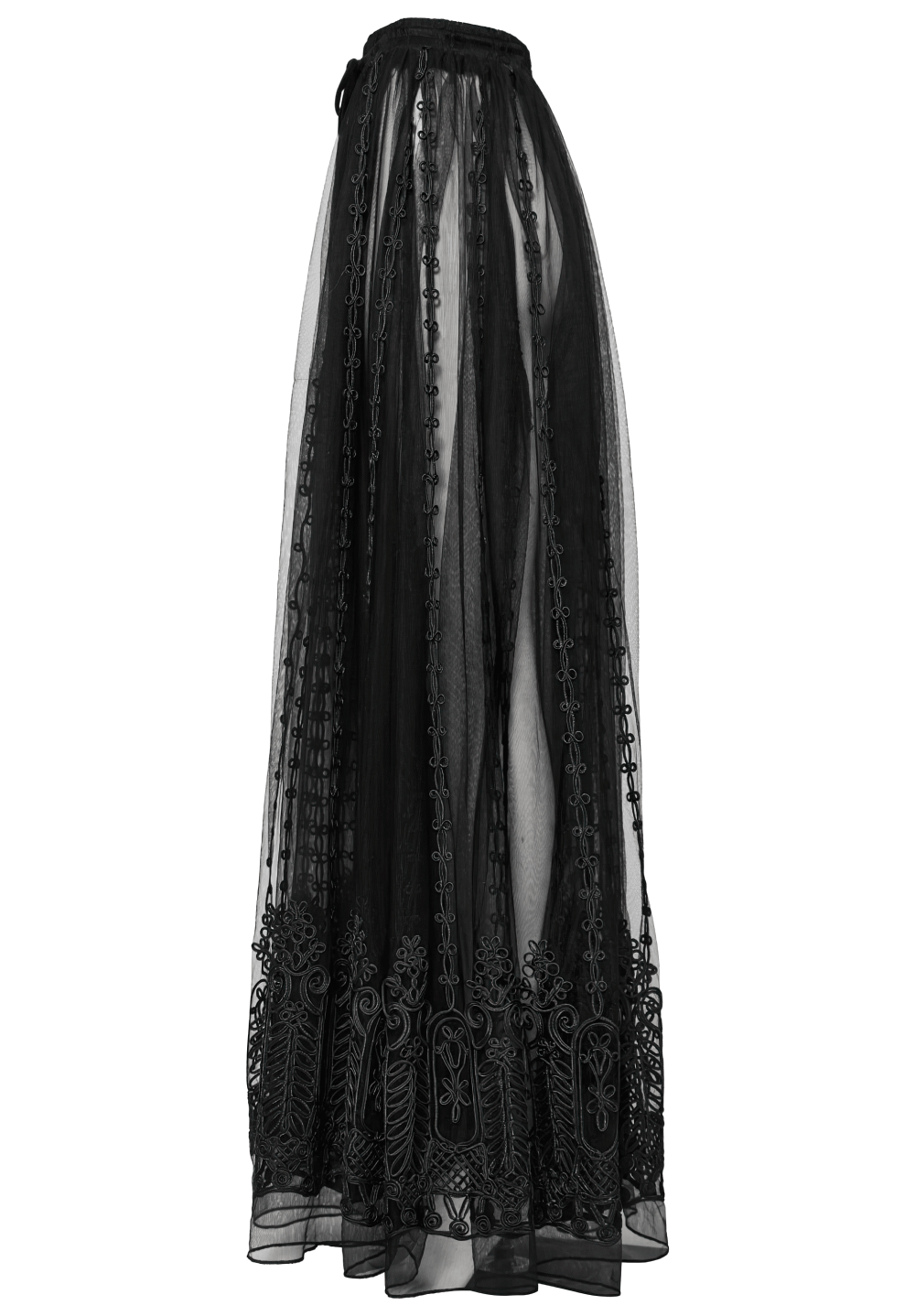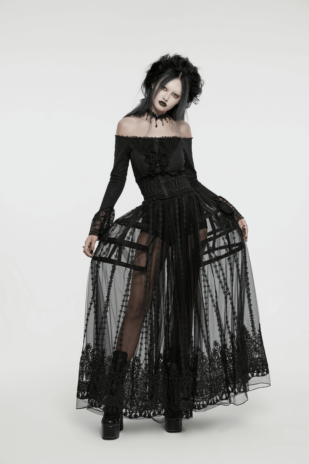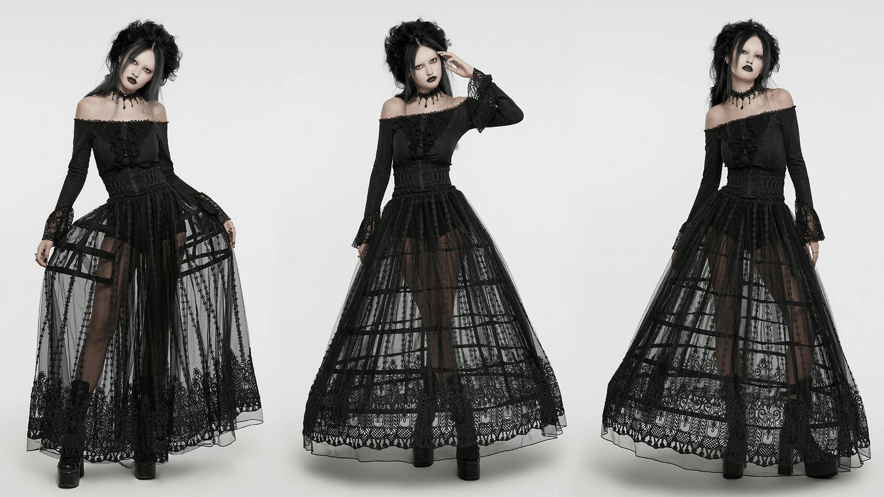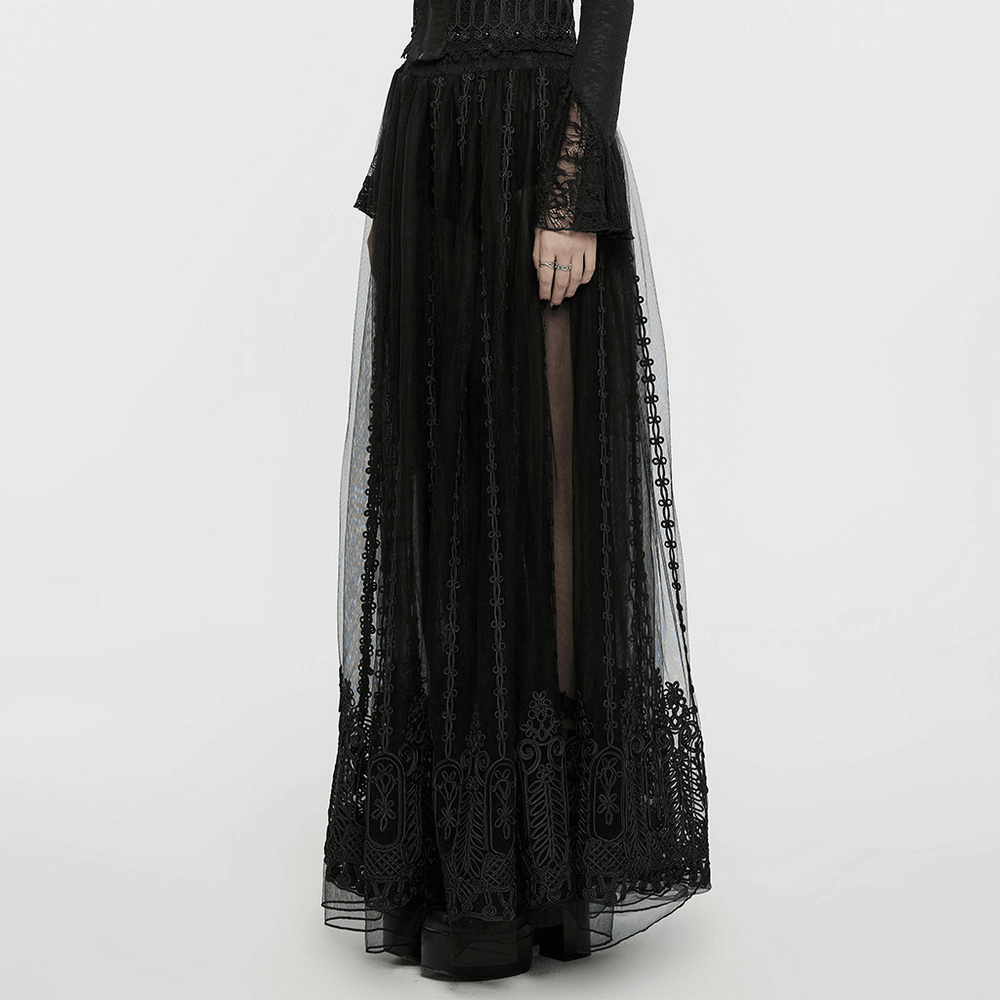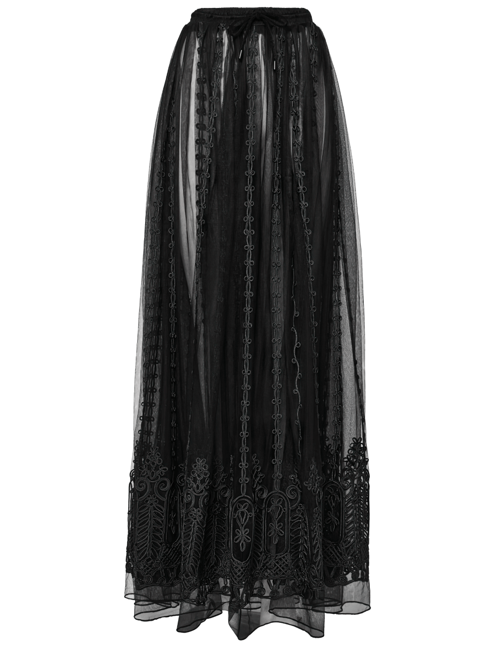 3D Embroidered Goth Skirt - Gothic Maxi Skirt with Sheer Mesh.