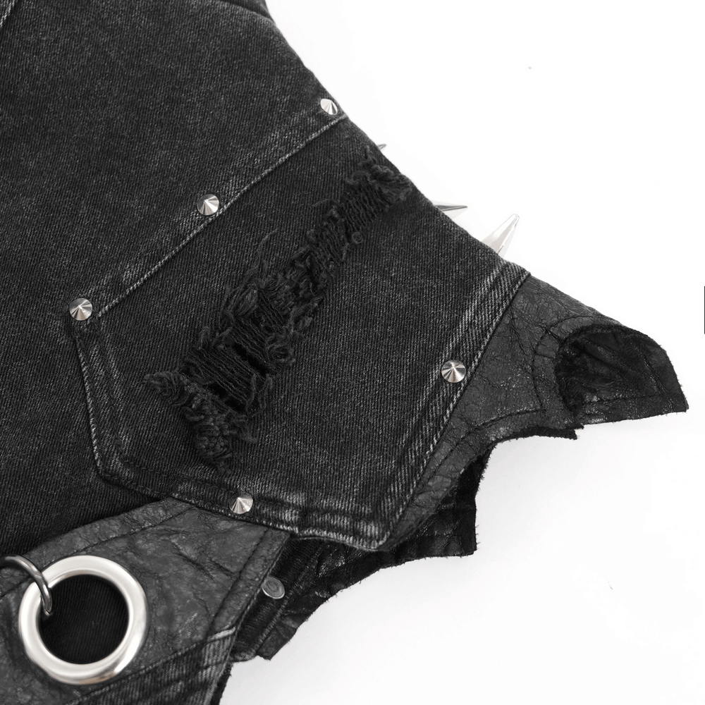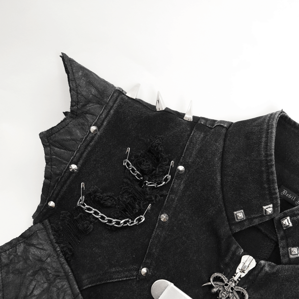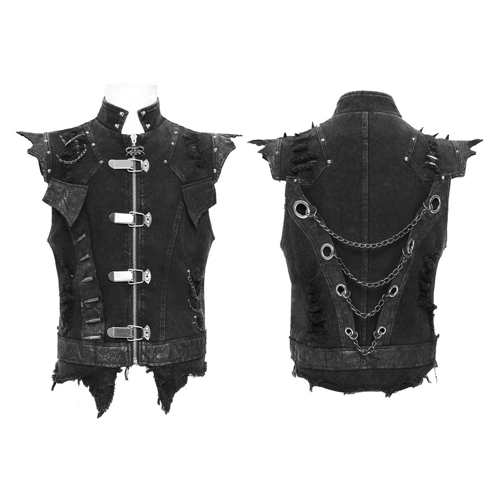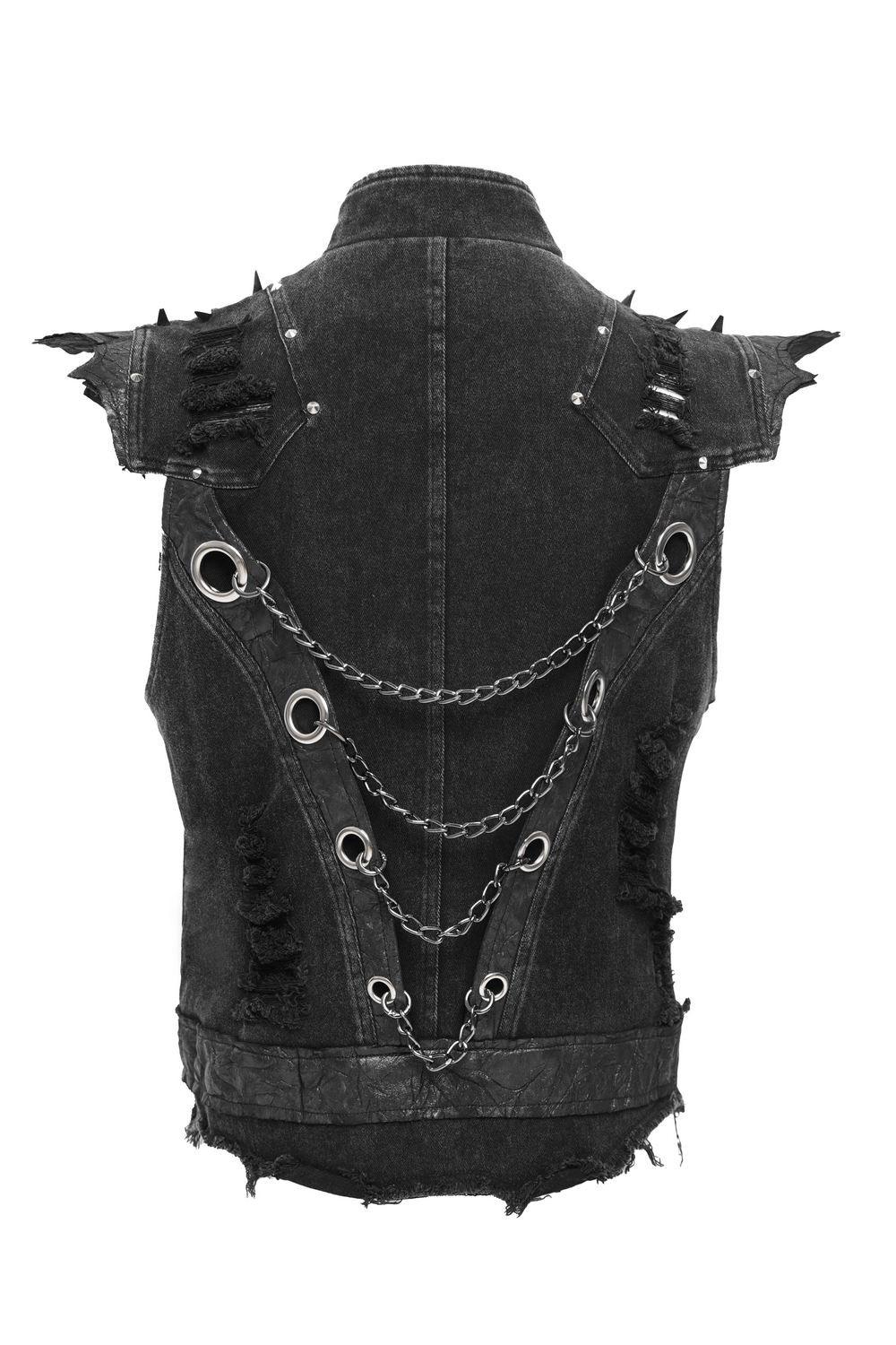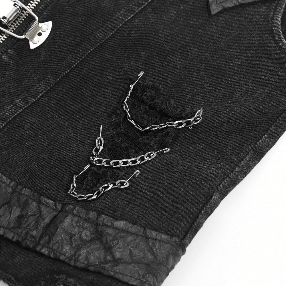 Unleash your rebellious side with this men's gothic punk vest. Featuring rugged frayed edges, bold metal buckles, and striking chain embellishments, this sleeveless denim jacket is designed for a bold, edgy look. The zip-up front, distressed accents, and metal rings with draped chains create a standout piece perfect for concerts, festivals, or alternative fashion scenes.