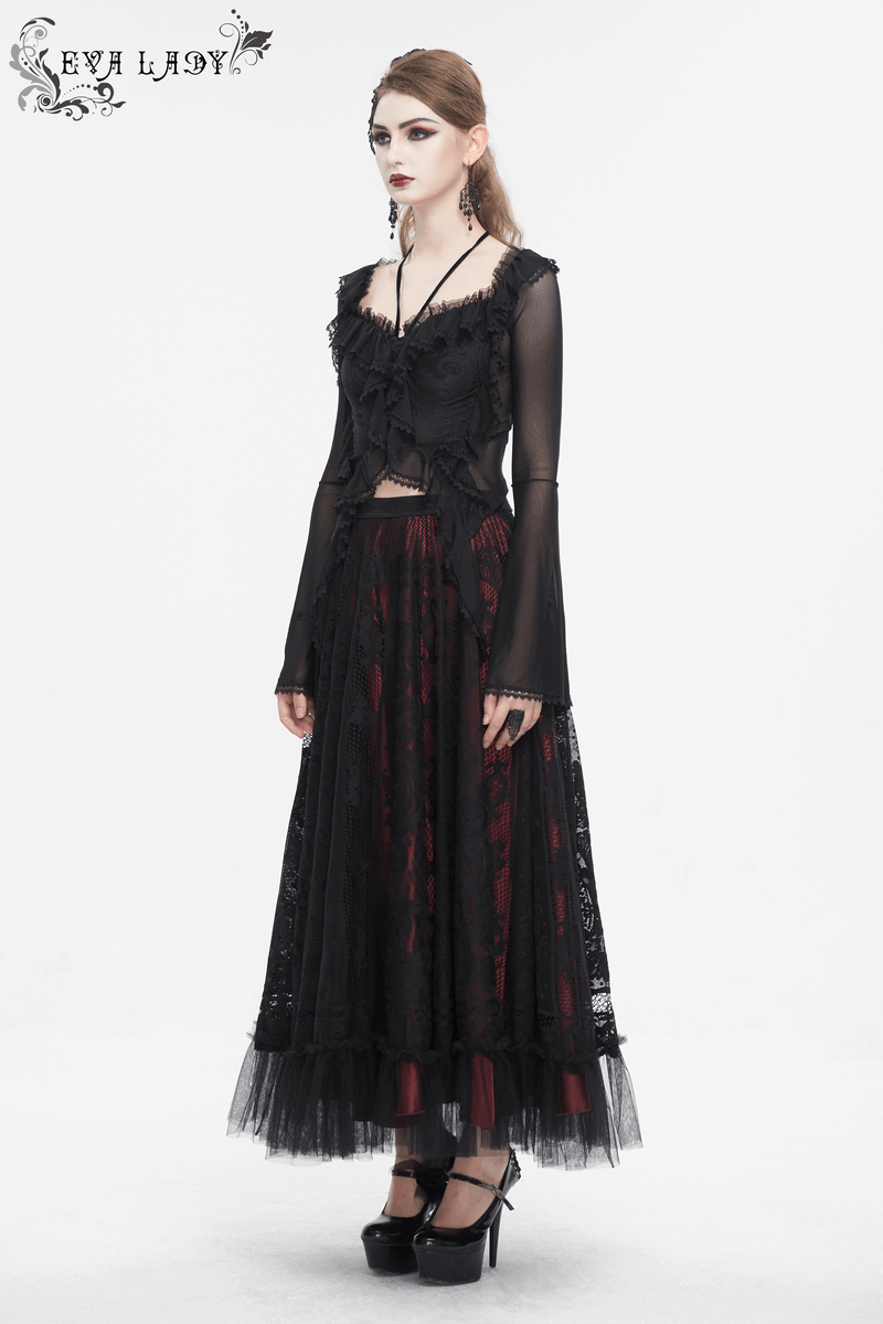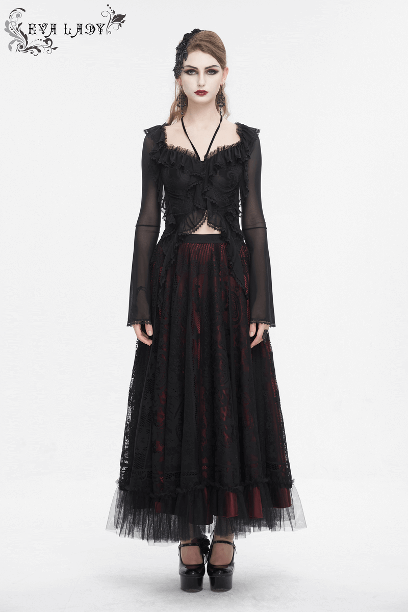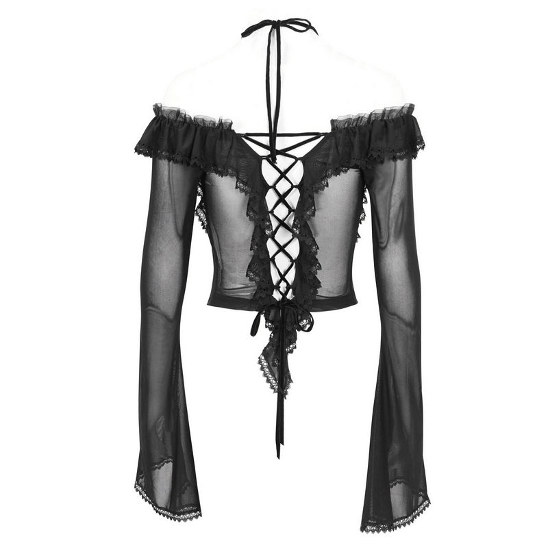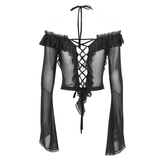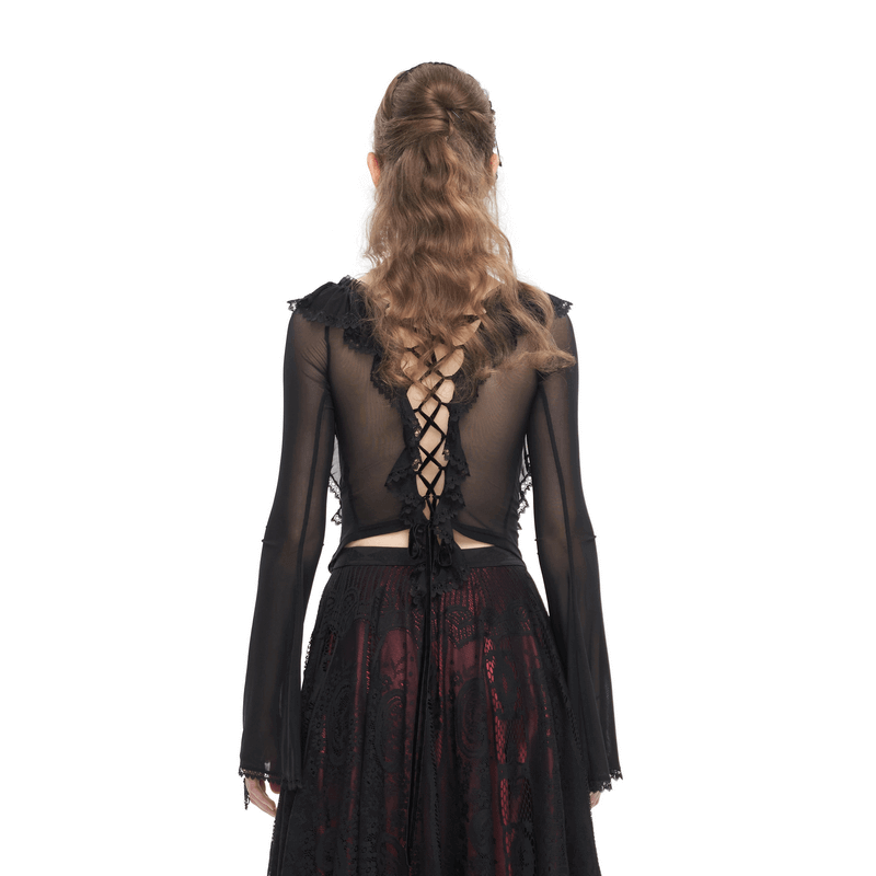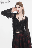 Gothic Ruffled Women's Top with Sheer Sleeves and Back Lace-Up