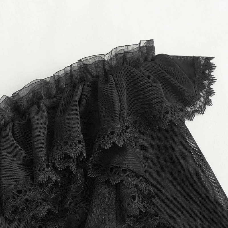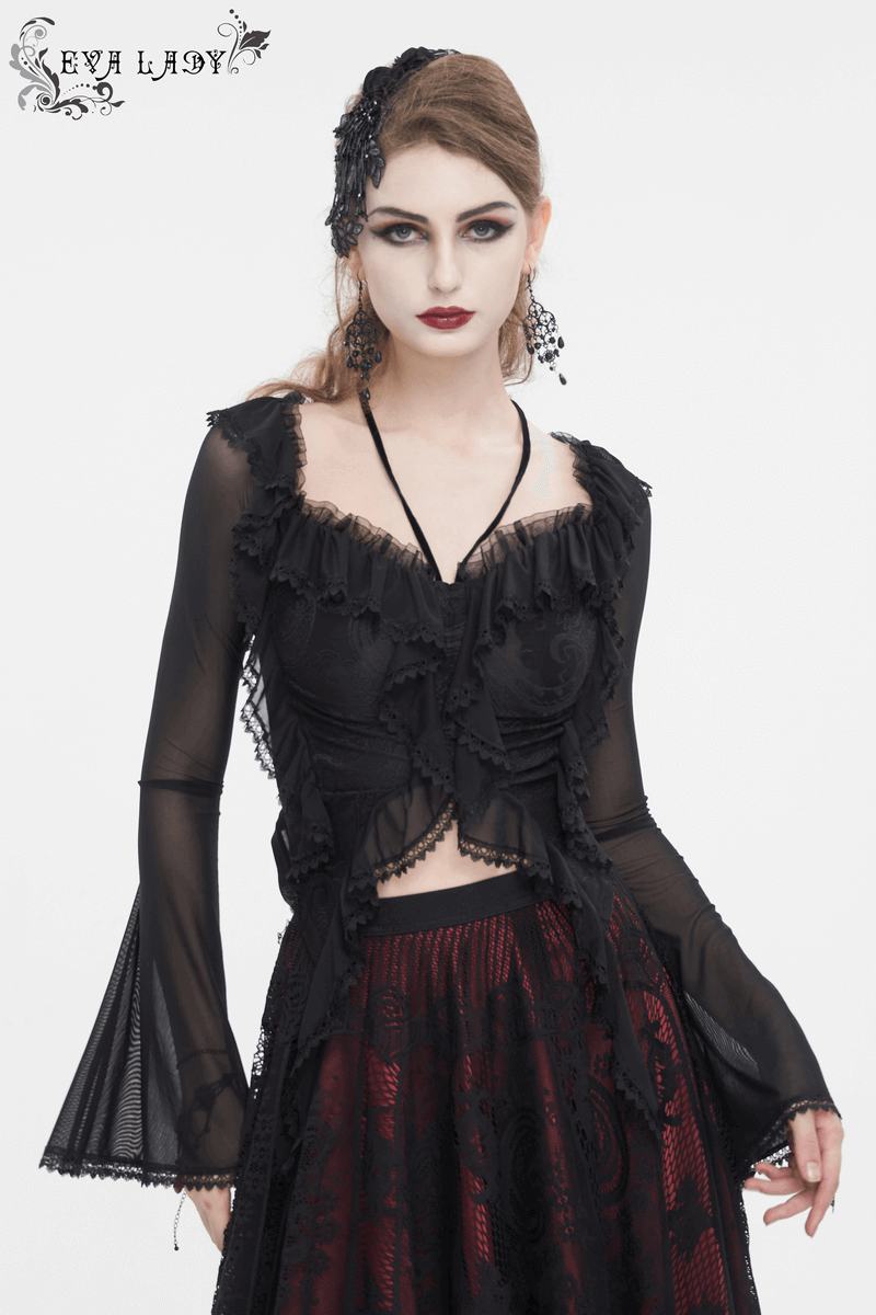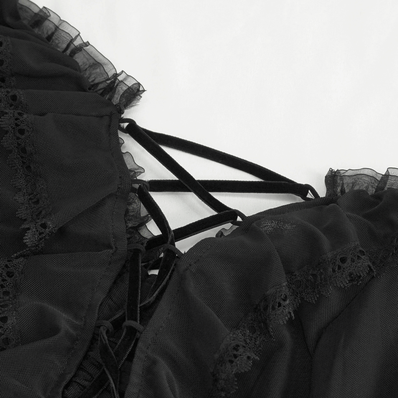 Reveal the perfect blend of gothic charm and chic style with our women's ruffled top. Featuring luxurious ruffles and airy, sheer sleeves, this piece exudes elegance. The lace-up back detail adds a hint of mystery, making it a standout in any setting. Ideal for those who embrace both sophistication and the alternative. Enhance your wardrobe with this distinctive top.