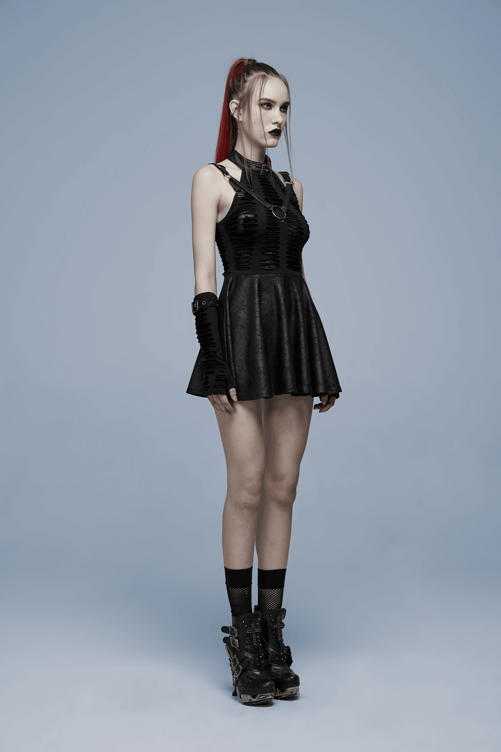 Embrace your gothic side with this bold cutout dress, melding soft knitted fabric with detailed spider web cloth. The front showcases a striking cut, guaranteeing you command attention with unparalleled uniqueness while boosting allure. Customize the fit with adjustable shoulder straps, and let the delightful swing skirt hem infuse a playful element into your attire. Ideal for those unafraid to showcase their individuality with a touch of allure.