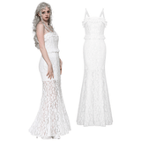 This sophisticated white lace mermaid gown boasts slender spaghetti straps and charming ruffled accents. The contoured bodice flatters the waist, leading into an elegant flared skirt. Ideal for weddings, formal gatherings, or special moments, this stylish dress blends classic lace with contemporary design, ensuring you shine in every setting.