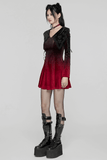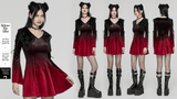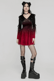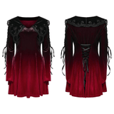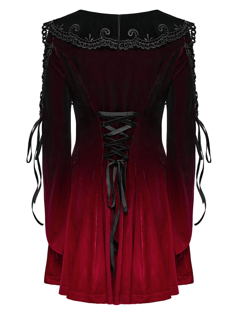 This captivating velvet gradient dress boasts an A-line hem and flared sleeves for a graceful look. Intricate lace straps accent the upper arms, exuding sophistication. A heart-shaped cut-out collar adds a whimsical flair. Designed with a side zipper and adjustable lace-up back for a tailored fit. Ideal for lovers of dark romance seeking a blend of charm and elegance in their wardrobe.