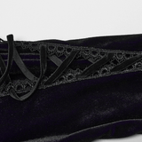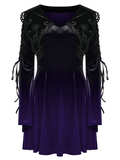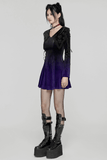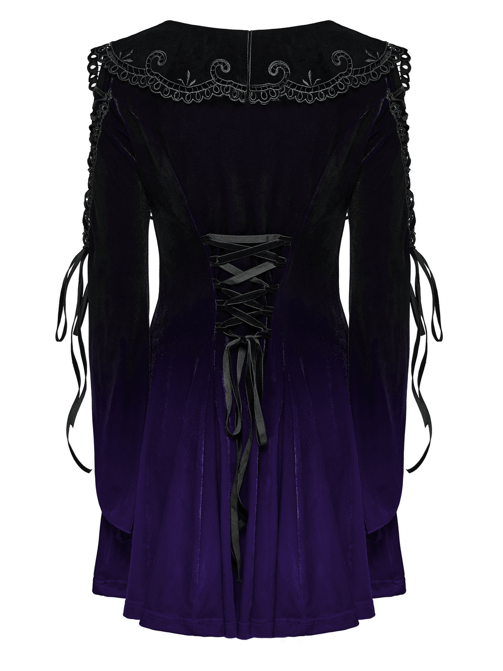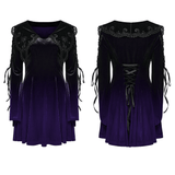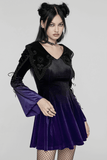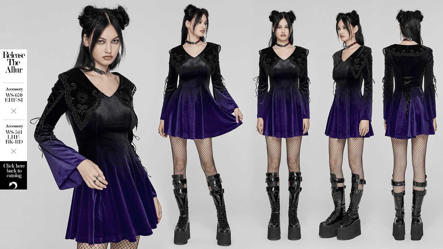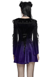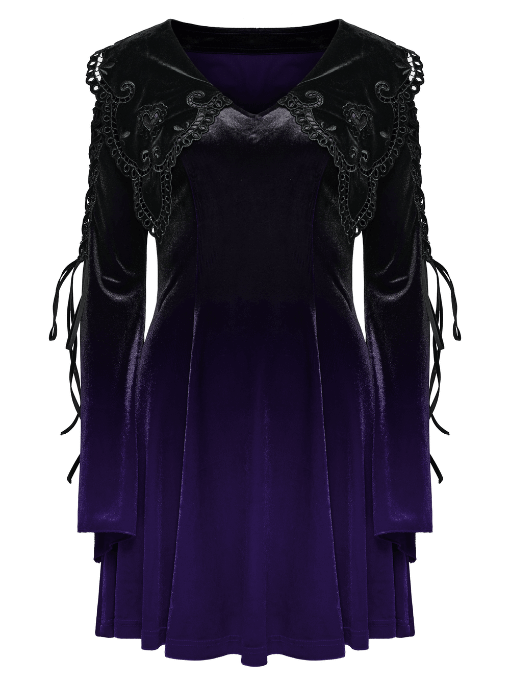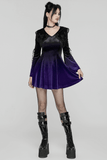 This gothic dress features soft gradient elastic velvet with a heart-shaped hollow collar. The A-line hem and flared sleeves offer elegance, while lace straps add detail. A side zipper and back drawstring ensure a perfect fit. Ideal for fans of gothic-inspired style, this piece blends playful charm with a bold, dramatic touch.
