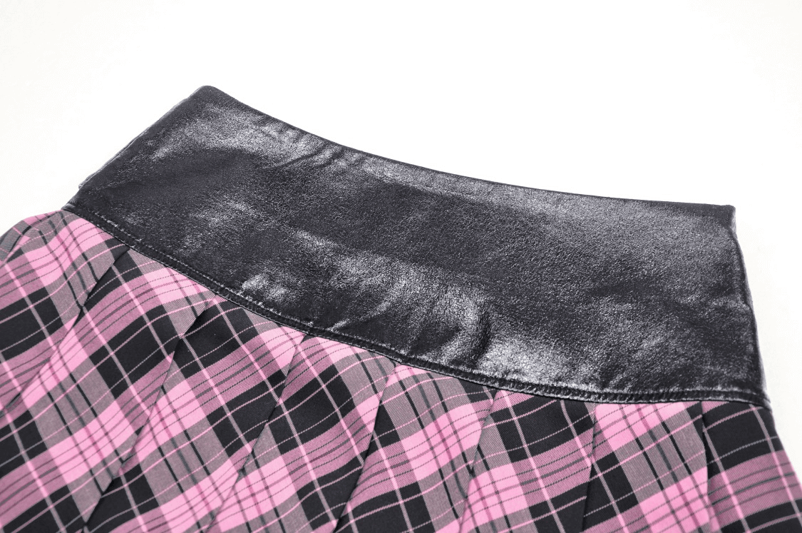 Embrace rebellion with this striking pink and black plaid mini skirt. The timeless punk rock design receives a contemporary twist with a daring color mix and edgy grommet belt feature. Its high-waisted style complements your shape, and the A-line cut adds a playful and feminine touch. Team it with a band tee and combat boots for an authentic punk rock feel, or elevate it with a black top and heels for an evening out. Crafted from a soft and airy fabric, this skirt suits every event.