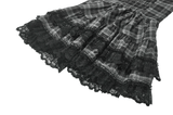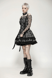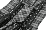 Embrace your dark sophistication with this gothic plaid mini dress, highlighted by corset lace-up features, studded harness straps, and layered lace ruffles. Its contoured bodice sharpens your figure, and the flared skirt introduces a punk-style flair. Ideal for aficionados of alternative fashion, this striking garment matches seamlessly with fishnet stockings and striking accessories.
