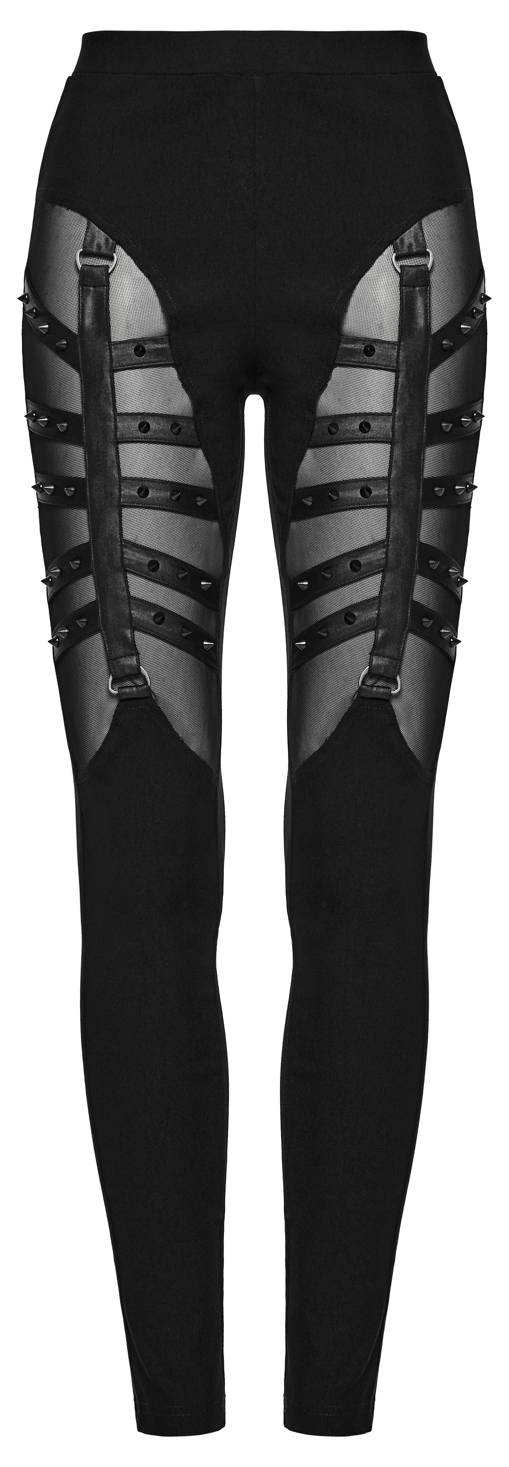 Upgrade your edgy style with these black mesh panel leggings, showcasing a sultry split perspective and bold spiral studded horizontal tab detail. Crafted from a mix of elastic twill woven and mesh fabric, these leggings embrace your curves while offering an attention-grabbing fit. Ideal for festivals, concerts, or injecting a punk rock flair into your daily attire.
