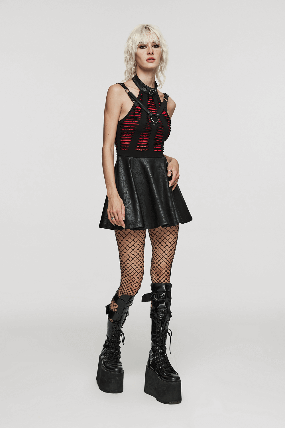 Tap into your inner dark allure with this Punk Rave spiderweb mesh cutout mini dress. Crafted from soft knitted fabric interlaced with sultry mesh, it sculpts a distinctive silhouette that accentuates your curves. The bold chest cutout injects an edgy vibe, while the customizable shoulder loops and whimsical swing skirt hem add a hint of sweetness. Versatile enough for clubbing, dancing, or a night out, this dress is a must-have gothic essential. Flaunt your mysterious charm and captivate attention in this standout piece.