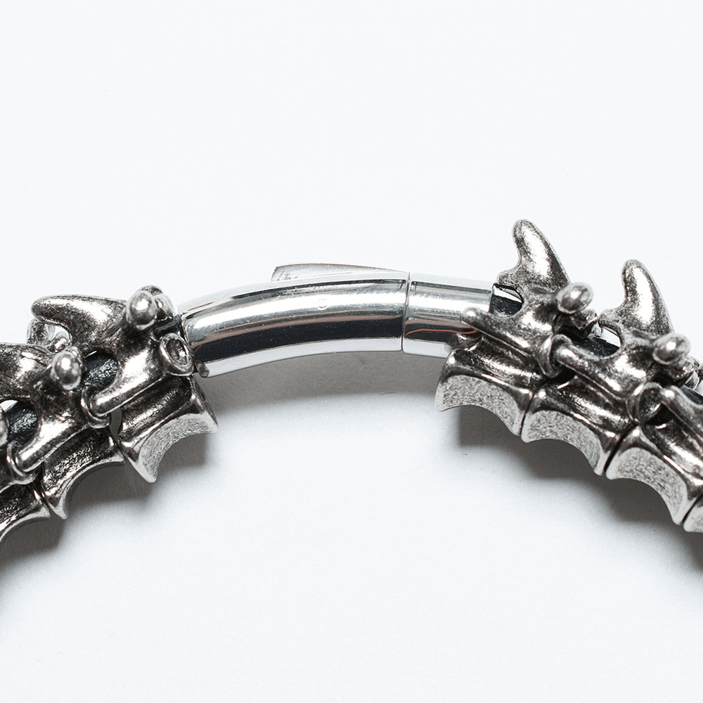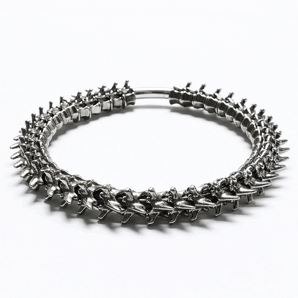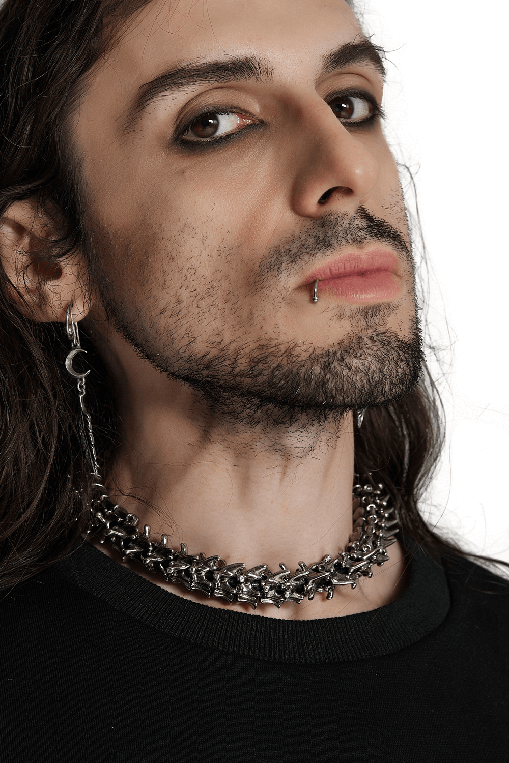Made of alloy, this punk-inspired choker showcases a striking simulated spine design, blending retro charm with an edgy vibe. The magnetic clasp ensures effortless wear while adding a modern touch. A textured statement piece, it's perfect for those who embrace alternative or apocalyptic aesthetics. Complete your look with this spine-style neck ring, ideal for punk and gothic fashion.