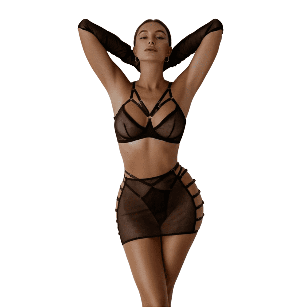 This provocative and sultry ensemble is a striking choice for those looking to make a statement in the realm of boudoir fashion. The outfit features a daring, sheer mesh bra with structured strappy detailing that accentuates the silhouette, paired with matching high-waisted briefs that offer a tantalizing peek while still leaving a bit to the imagination. Both pieces are edged with delicate trim, enhancing their allure. Completing the look are elegant opera-length gloves that give off an air of sophistication and mystery. This ensemble is perfect for a night of indulgence or as a bold fashion statement at an exclusive event.