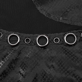 Embrace your rebellious side in this snake-skin patterned dress crafted from rubberized knit fabric and mesh. The form-fitting silhouette is highlighted by prominent metal eyelets at the front, evoking a punk vibe. A provocative hollowed-out waistline offers a tantalizing peek of skin, while the zippered back ensures effortless wear. Ideal for individuals seeking to stand out, this dress makes a fearless fashion statement, blending style with defiance.