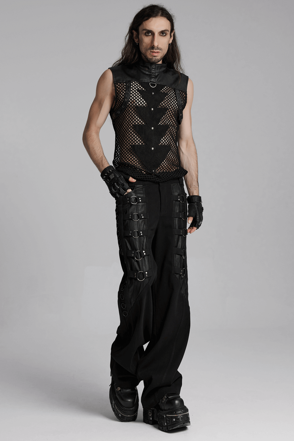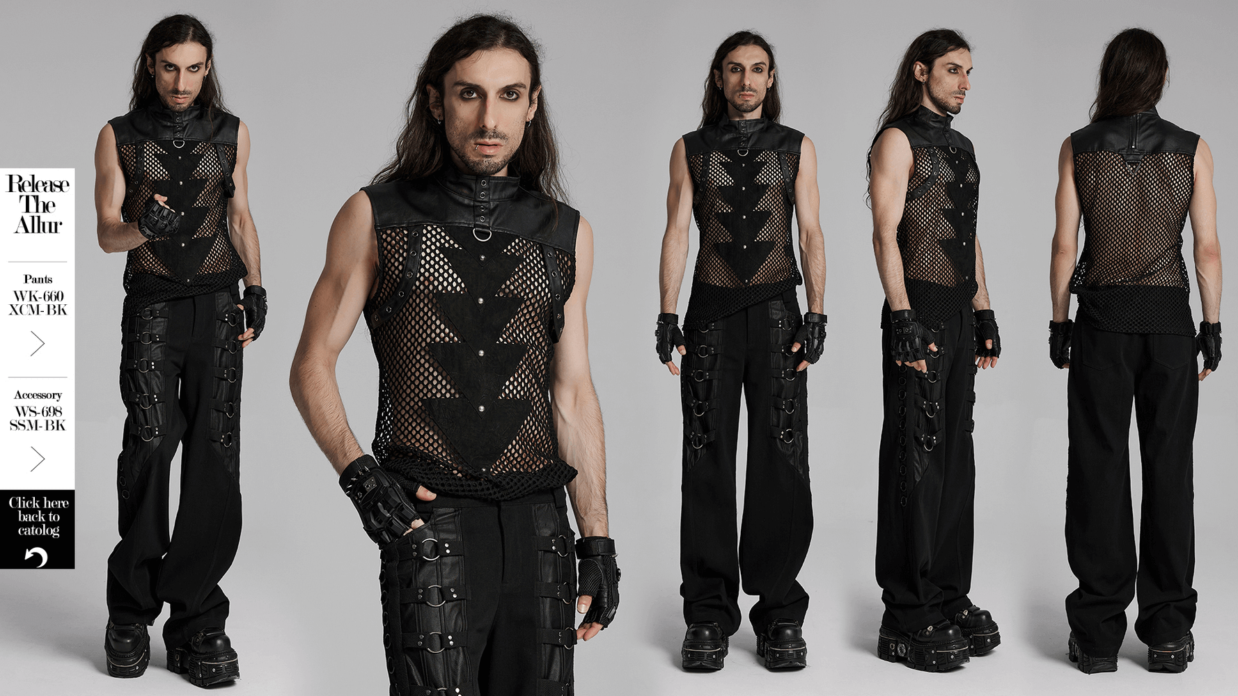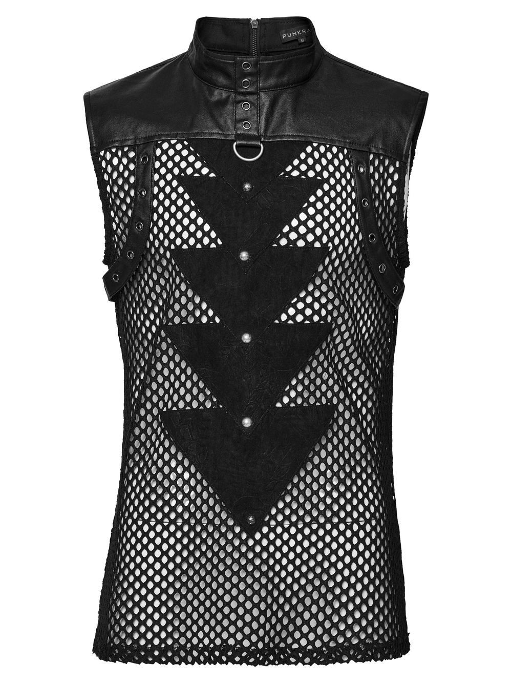 This bold vest blends mesh, rubberized twill fabric, and textured PU leather for a standout style. The front showcases a triangular splicing design with semi-circular rivet accents, adding to its edgy look. A back zipper offers easy wear, making it an ideal addition to any punk-inspired wardrobe.