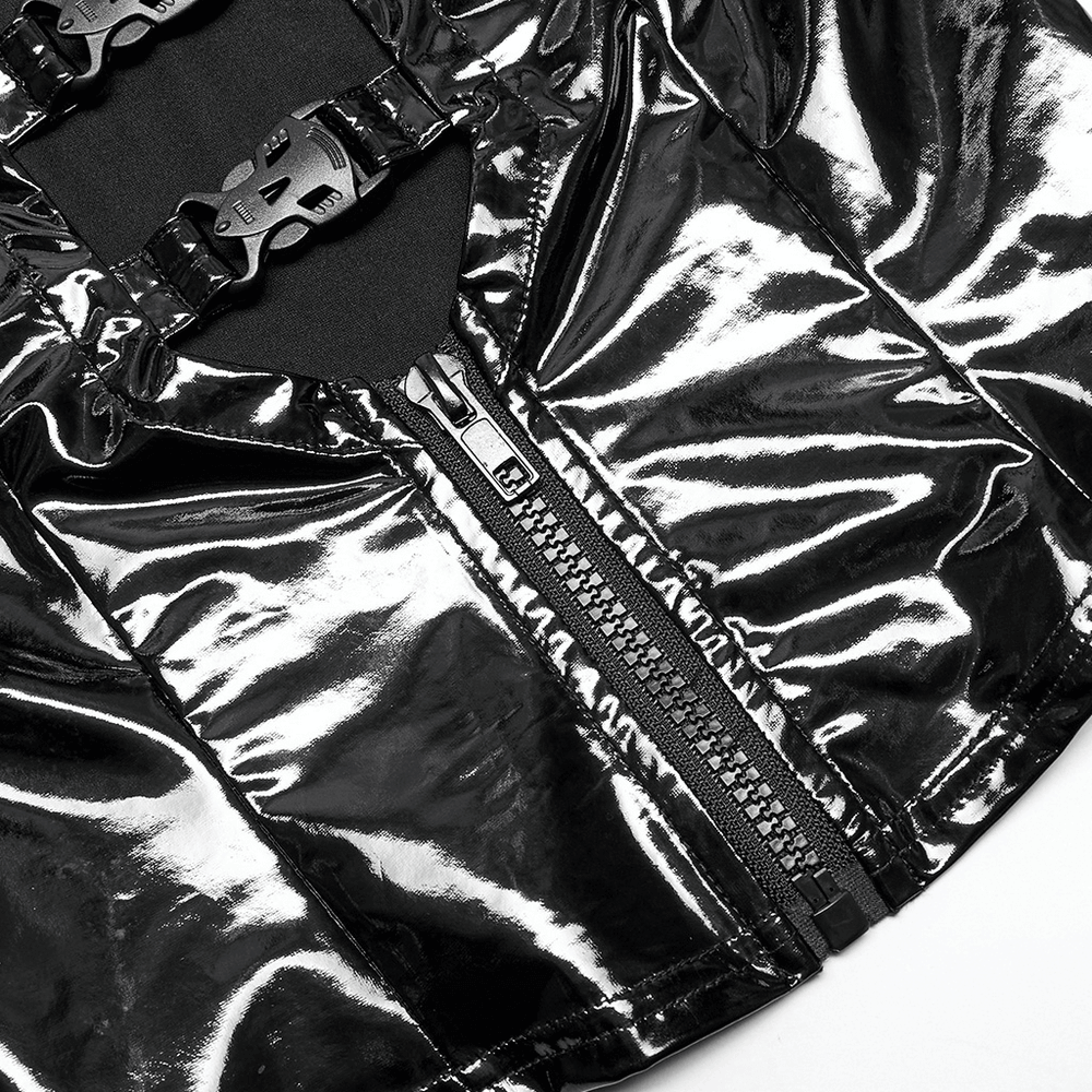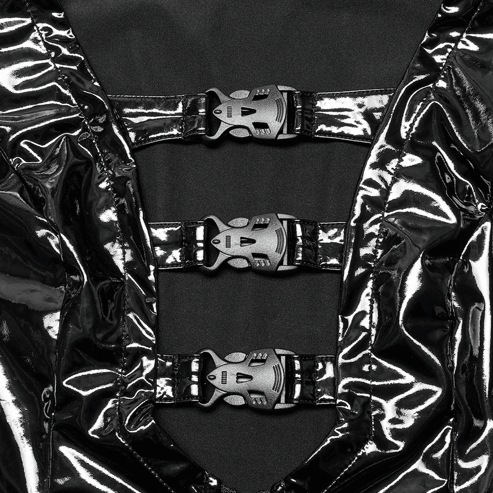 Find the flair your closet craves with our Gothic Buckles Patent Leather Slim Vest. Crafted from rubberized knitted fabric, this slim-fit vest flaunts a sultry hollow-out chest design accentuated by distinctive grimace buckles. Complete with a convenient waist zipper, it guarantees effortless wear. It's ideal for injecting a daring statement into your ensemble and essential for those who crave attention.