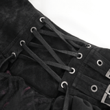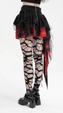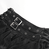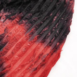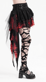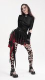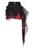Embrace your dark side with this tiered asymmetrical gothic skirt, mixing bold red with classic black. Adorned with lace, flowing tulle, and adjustable lacing for a custom fit, it enhances any alternative wardrobe. The distinct hemline and edgy buckle accents make it ideal for goth, punk, or steampunk looks. Make a statement at your next event with this stunning piece!