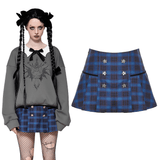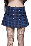 Upgrade your alternative wardrobe with this blue and black plaid mini skirt. With bold star-embellished button details and a timeless pleated design, this skirt blends edgy style with gothic elegance. The flattering A-line cut suits every figure, and the versatile plaid print pairs effortlessly with boots, tights, or layered tops. Make this standout piece a part of your collection.