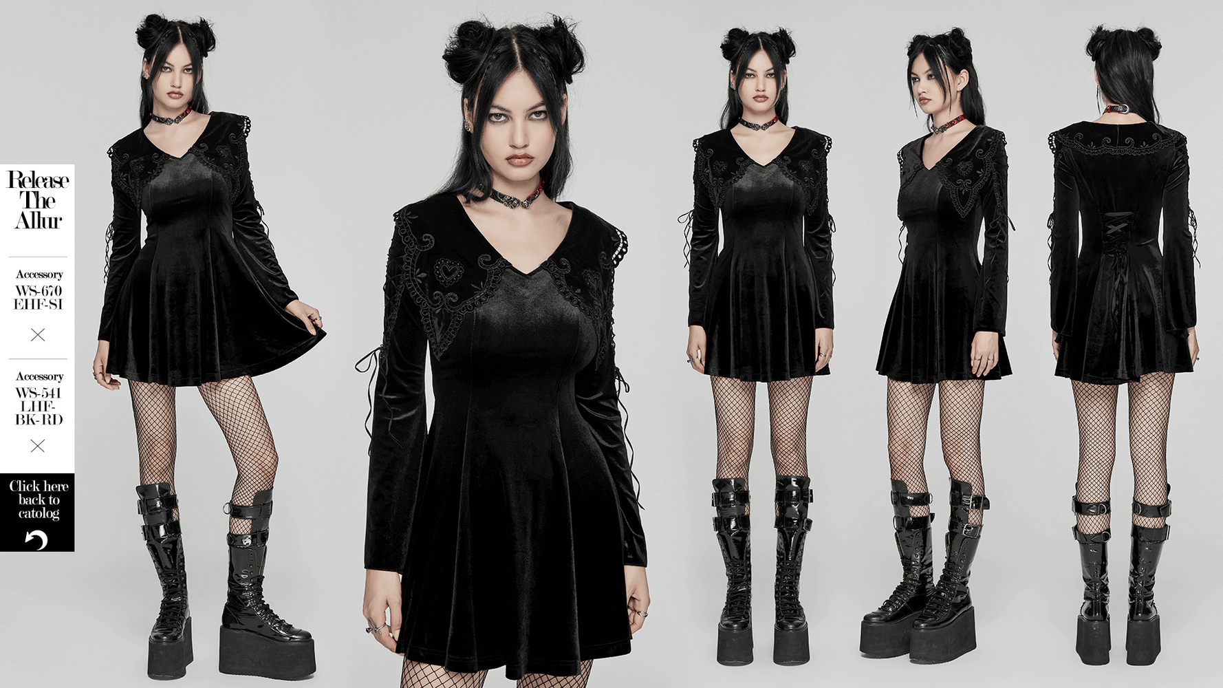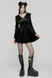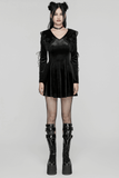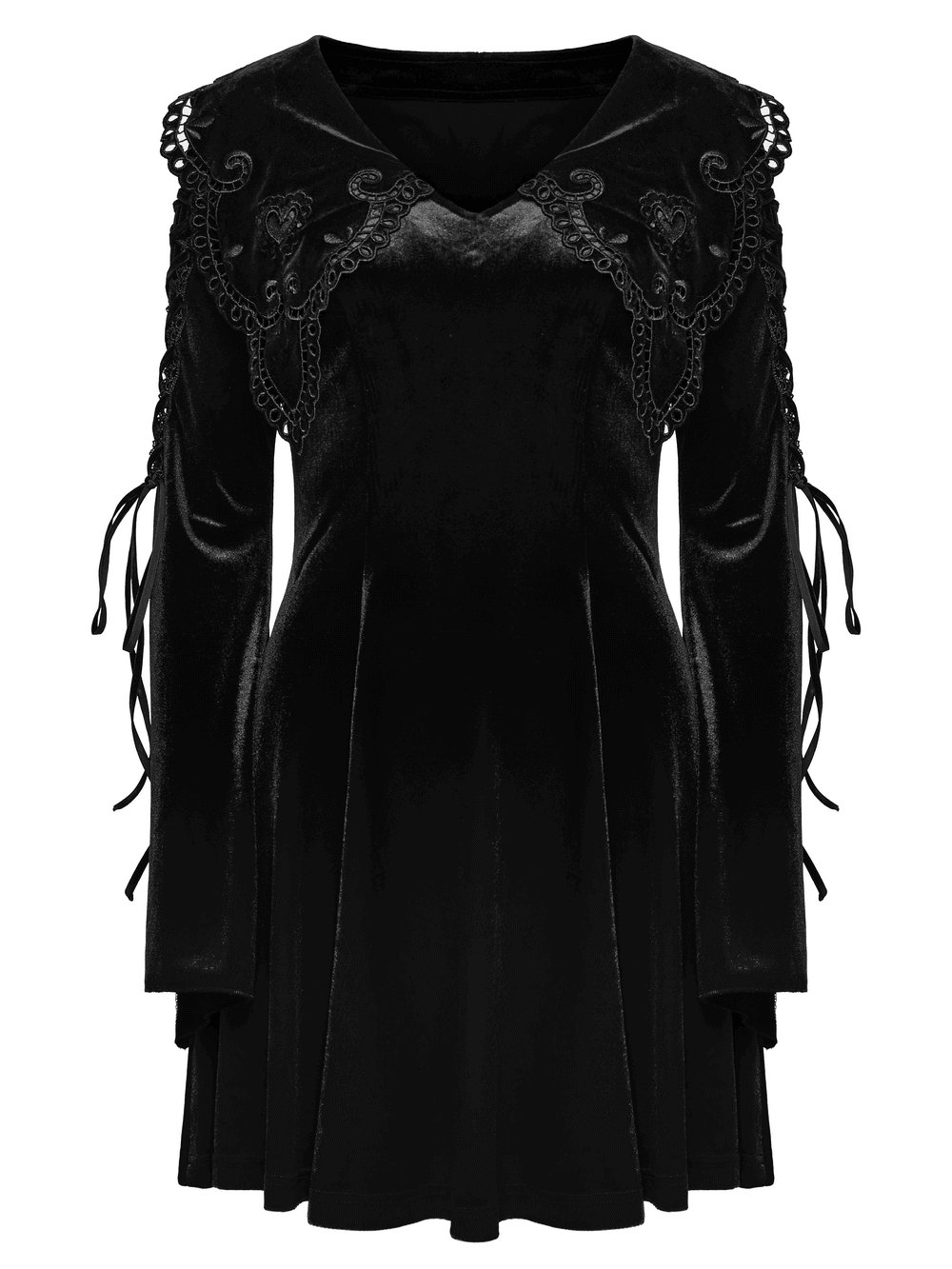 This elegant black dress is crafted from gradient elastic velvet, showcasing an A-hem and flared sleeves for a graceful silhouette. Delicate lace straps enhance the upper arms with intricate detail. A playful heart-shaped hollow collar adds charm, while the side zipper and back drawstring offer a figure-flattering fit. Ideal for gothic styles with a blend of sweetness and femininity.