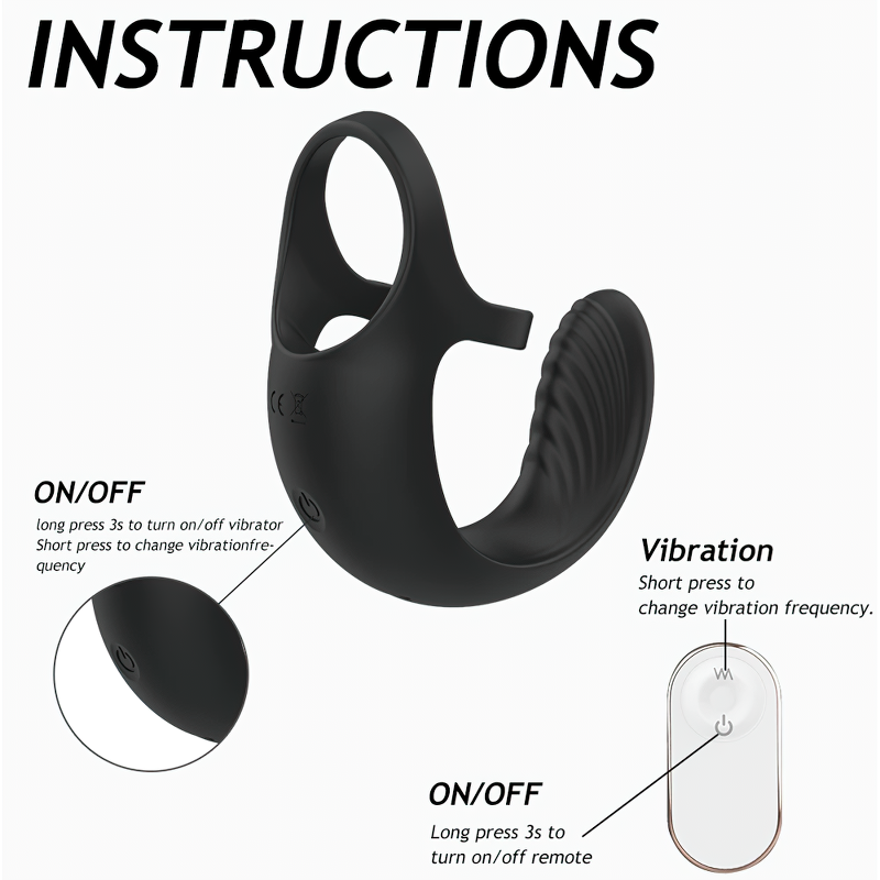 Long press to turn on/off the vibrator, short press to change vibration frequency. Long press 3 seconds to turn on/off the remote, short press to change vibration frequency.