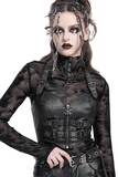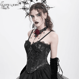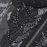 Crafted from brocade-style fabric, this gothic corset boasts bold lace trim, a dangling cross pendant, and flowing black chains. The silhouette is defined with adjustable shoulder straps, a lace-up back, and standout garter straps. Gothic stitching and a tiered build give Victorian edge a punk twist. Pair it with a tulle skirt or sleek pants to create a dramatic and unforgettable ensemble..