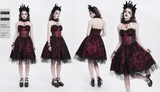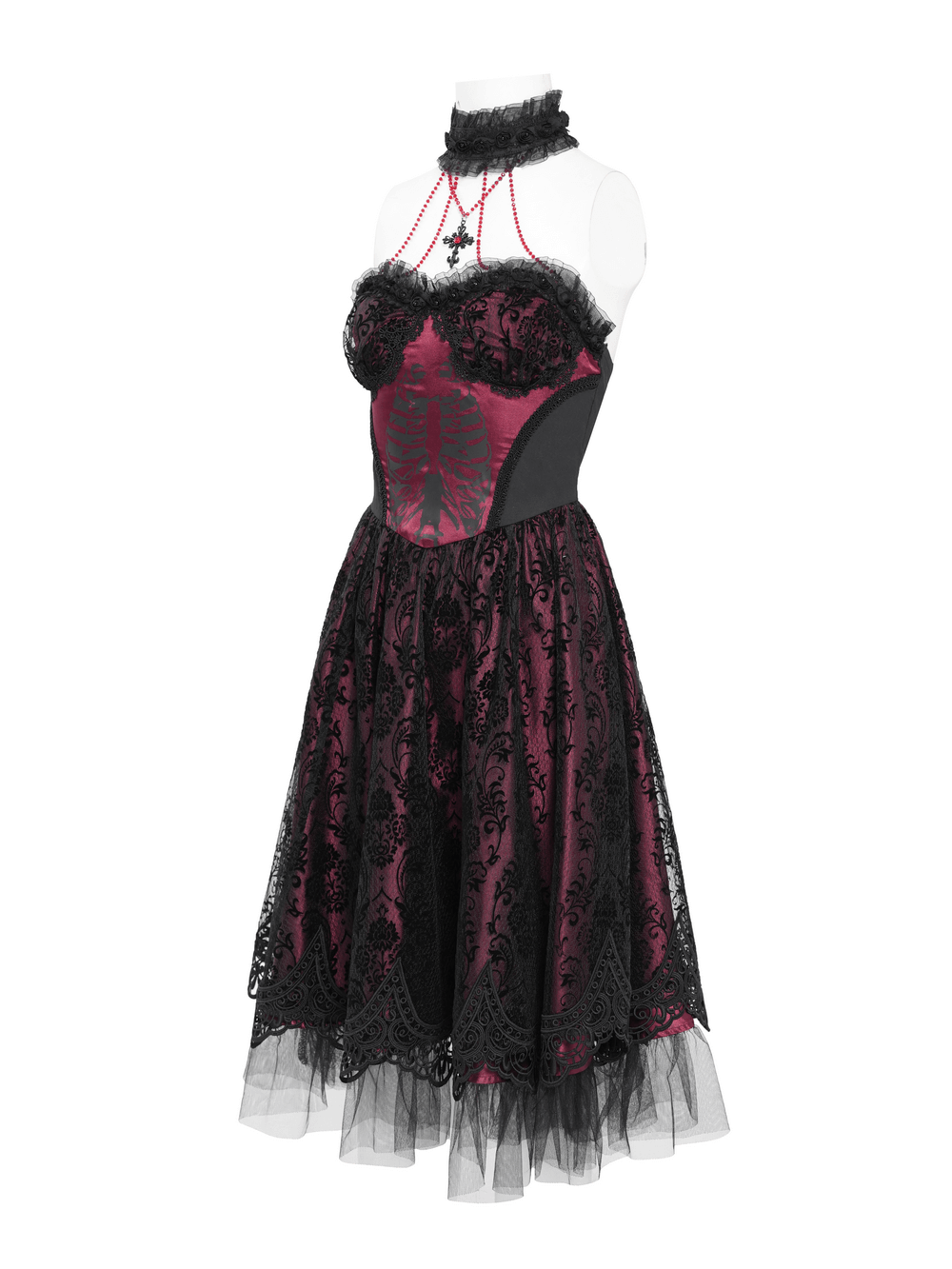 Embrace the dark charm of our gothic dress, adorned with a bold skeleton print. This black and burgundy corset piece fuses gothic elegance with fine lace and a voluminous tulle skirt for maximum drama. Whether for costume parties or statement fashion moments, this standout design is perfect for those who crave a look that’s equal parts edgy and enchanting.