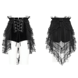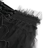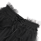 Elevate your wardrobe with these Gothic Lace-Up Black Ruffled Shorts. With a chic lace-up front, tulle ruffles, and beaded accents, they embody gothic sophistication. Ideal for punk and alternative looks, they blend edgy style with feminine flair, making them perfect for gothic events and unique occasions.