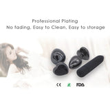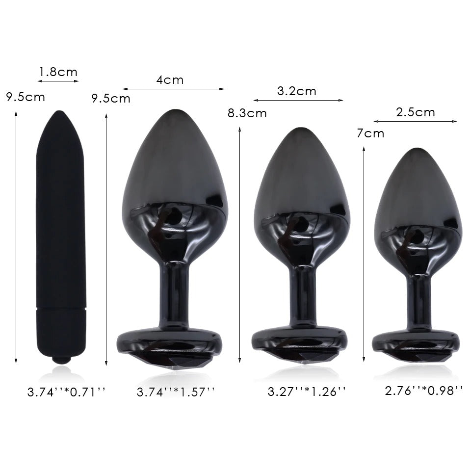 - Größe: Kleiner Analplug 7 cm, Mittlerer Analplug 8,3 cm, Vibrator 9,5 cm (2,75''*0,98'', 3,26''*1,18'', 3,74''*0,7'')