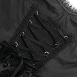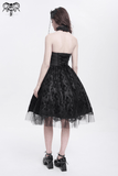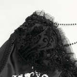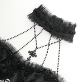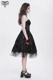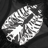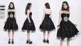 Stand out in this gothic halter dress, showcasing a striking white ribcage print on a form-fitting corset bodice. Delicate lace overlay, a voluminous tulle skirt, and a detailed gothic neckpiece with bead chains bring dramatic flair. Ideal for Halloween, alt parties, or any occasion where bold gothic fashion is the goal—make your dark style unforgettable.