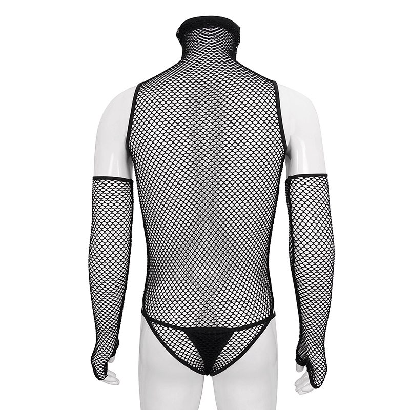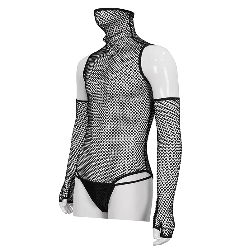 Fetisch Schwarzer, elastischer Mesh-Body mit hohem Kragen / Sexy Herren-Einteiler-Body mit Handschuhen