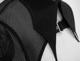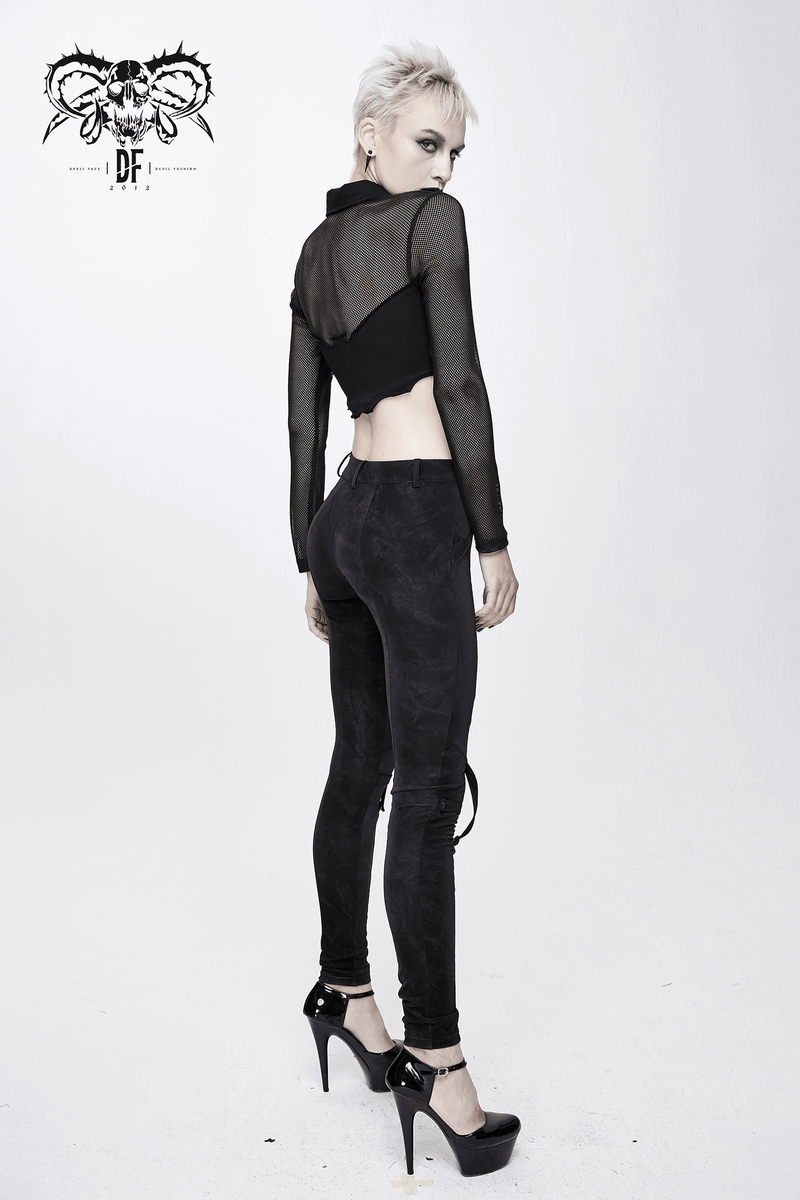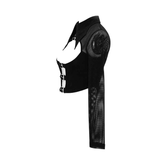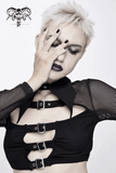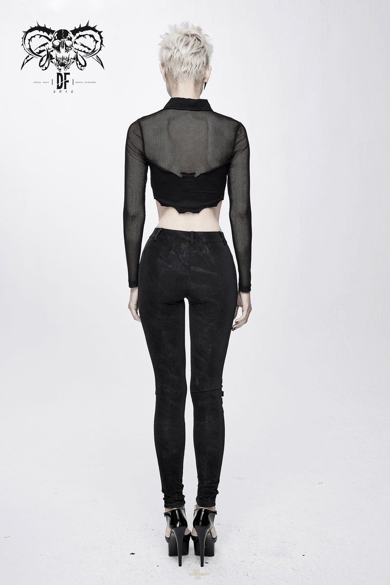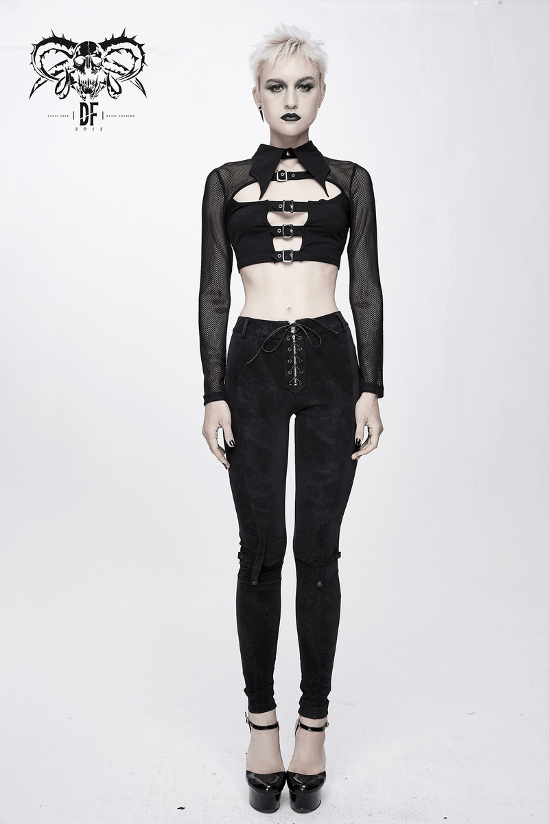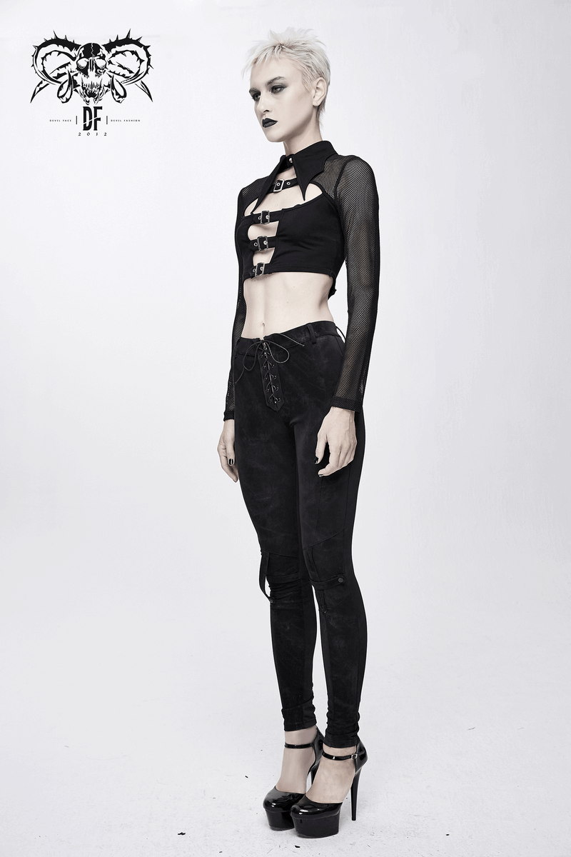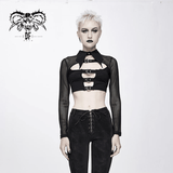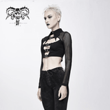 Damen-Crop-Top mit langen Netzärmeln und Schnalle / Punk-Gothic-schwarzes kurzes Mesh-Top mit Umlegekragen