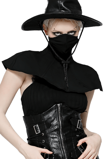 Gothic Neck and Shoulder Cape with Masked Dark Style.  Enhance your gothic style with this black-masked hooded cape. Featuring a structured neck and shoulder design, this accessory combines edgy appeal with practical wear. The back button closure ensures effortless use,...