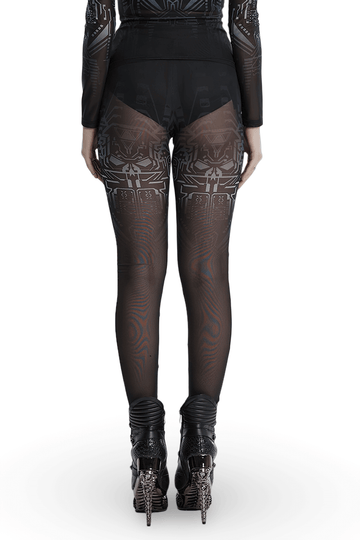 Bold Cyberpunk Pants with Gradient Skull Print for Edgy Style.  Upgrade your style with these Cyberpunk Skull Mesh Leggings, made from soft, elastic printed mesh and flexible knitted fabric. Featuring a sleek, slim fit, they highlight a futuristic mechanical skull...