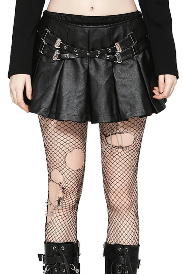 Faux Leather Pleated Mini Skirt with Edgy Belt Accents