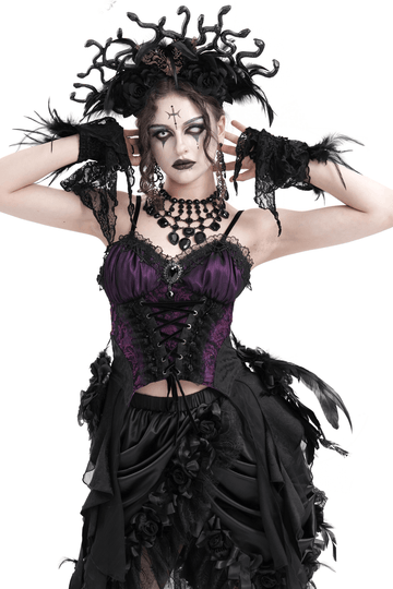 Graceful Gothic Corset Top Featuring Floral Accents. This Gothic Black Feather Corset Top exudes dark sophistication with its detailed floral accents and striking feather embellishments. Ideal for daring fashion at themed events or evenings out, it combines mystery with elegance....