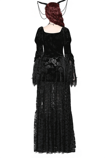 Black Gothic Maxi Dress with Sheer Panels and Lace-Up Back