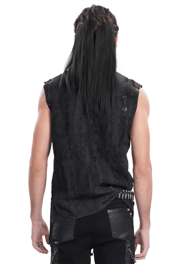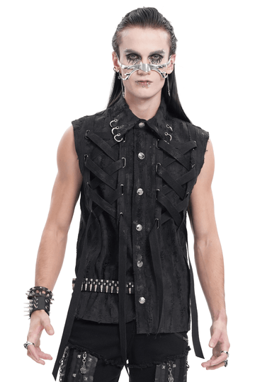 Punk Rock Dark Sleeveless Shirt with Lacing and Metal Rings.  Make a statement with this men's gothic punk sleeveless shirt, featuring textured fabric, striking lace-up details, and bold metal rings. The button-up front adds to its edgy appeal, while the...